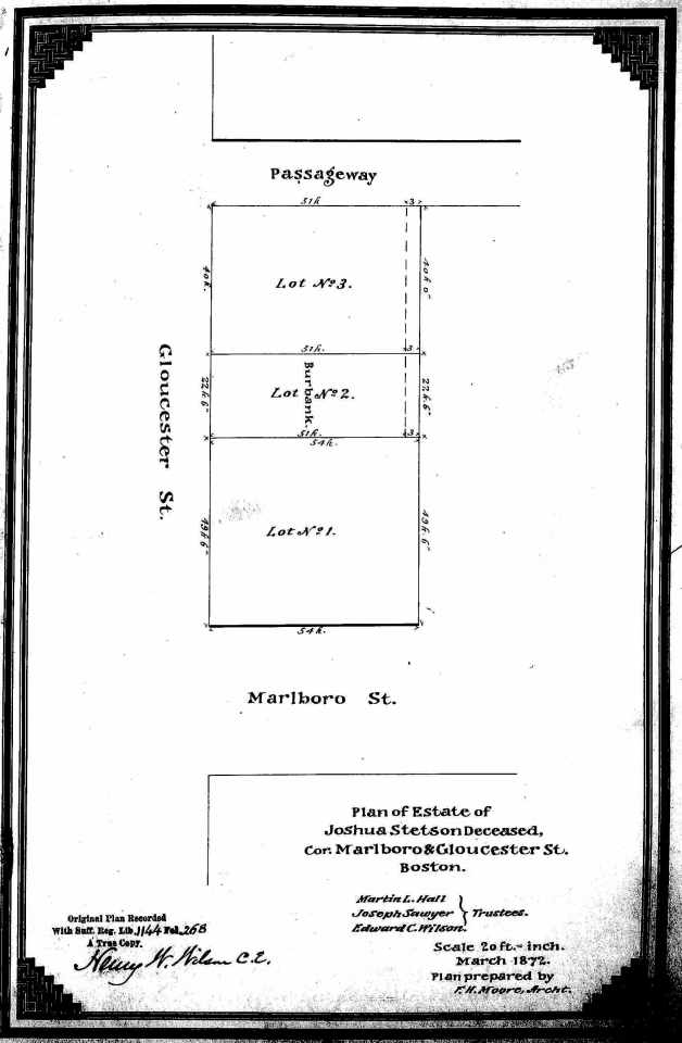 Deed 1144-268 (1872 Plan – 3-5-7 Glou) ← Previous Plot plan of 3-5-7 Gloucester, Suffolk Co. Deed Registry, Book 1144, p. 268 (Mar1872)