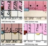 The oriel window on the first floor of 300 Beacon probably was added by the Rileys when they acquired 300 Beacon. As originally built, both 300 and 302 Beacon had flat front elevations, as they appear on the 1883 Bromley and 1885 Sanborn maps. The oriel at 300 Beacon was added in 1885 or later, and is shown on the 1887 Sanborn and 1888 Bromley maps.