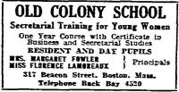 Miss La Moreaux and Mrs. Fowler lived at 315-317 Beacon and also operated the Old Colony School of Secretarial Training there. Both women previously had been affiliated with the Katharine Gibbs School. Florence La Moreaux had been director of the school at 247 Berkeley, where she also had lived, and Margaret Fowler had been a teacher at 151 Commonwealth where she also lived. Earlier, they had both been associated with the Wallcourt School in Aurora, New York.