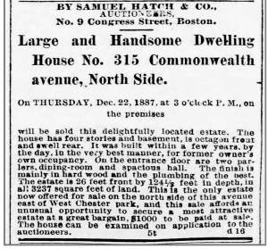 On December 22, 1887, 315 Commonwealth was offered for sale at public auction, the auction notice by Samuel Hatch & Co. noting that the “large and handsome dwelling house” had “two parlors, dining-room and spacious hall” on the entrance floor, and that the finish was “mainly in hard wood and the plumbing of the best.”