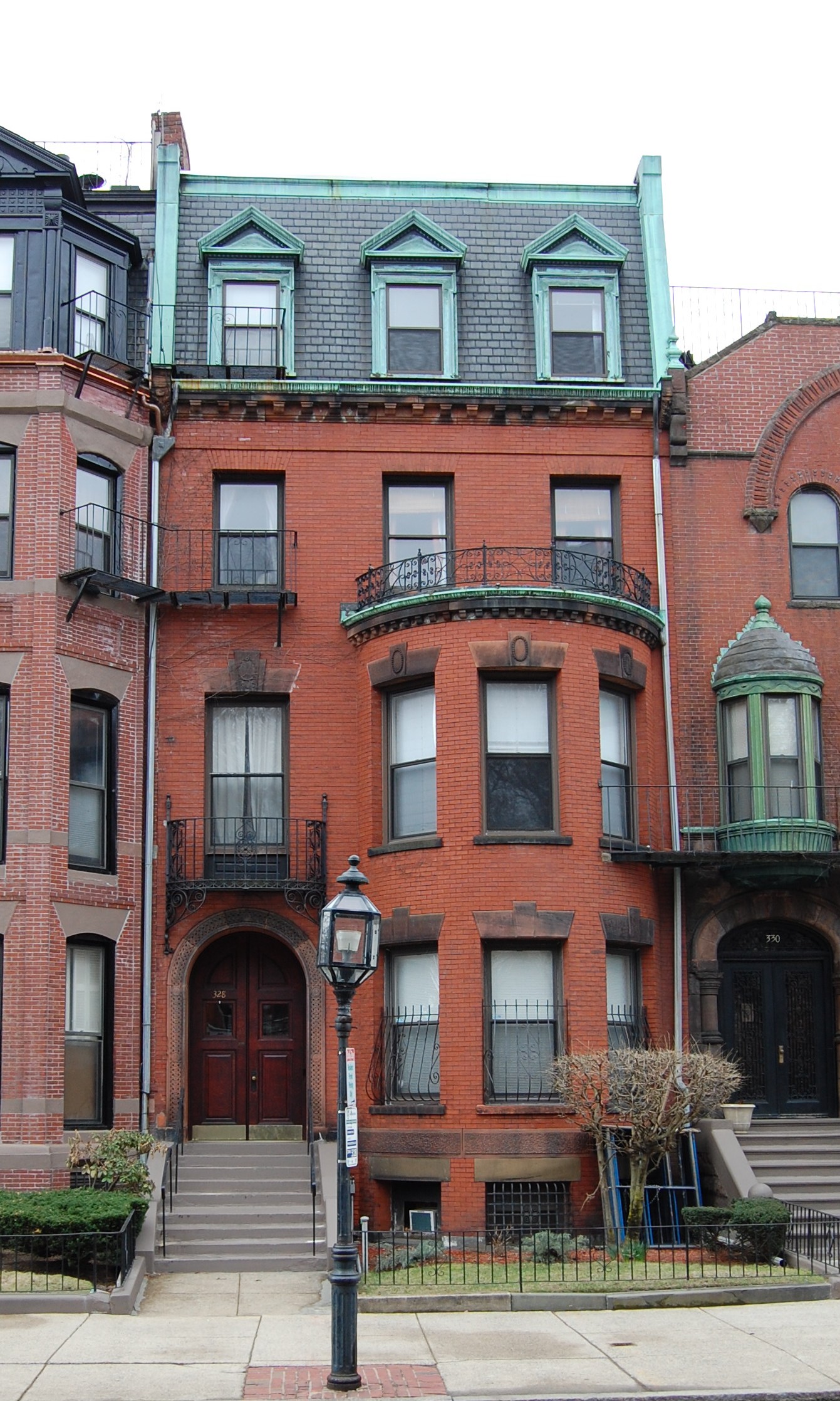 Probably as a result of this change in numbering, Bainbridge Bunting’s Houses of Boston’s Back Bay incorrectly reverses the information for 328 and 330 Commonwealth, indicating that the house now numbered 328 Commonwealth was built in 1888 and designed by O. H. Drisko (misread by Bunting as A. H. Drisko) and the house now numbered 330 Commonwealth was built in 1889 and designed by Winslow and Wetherell.