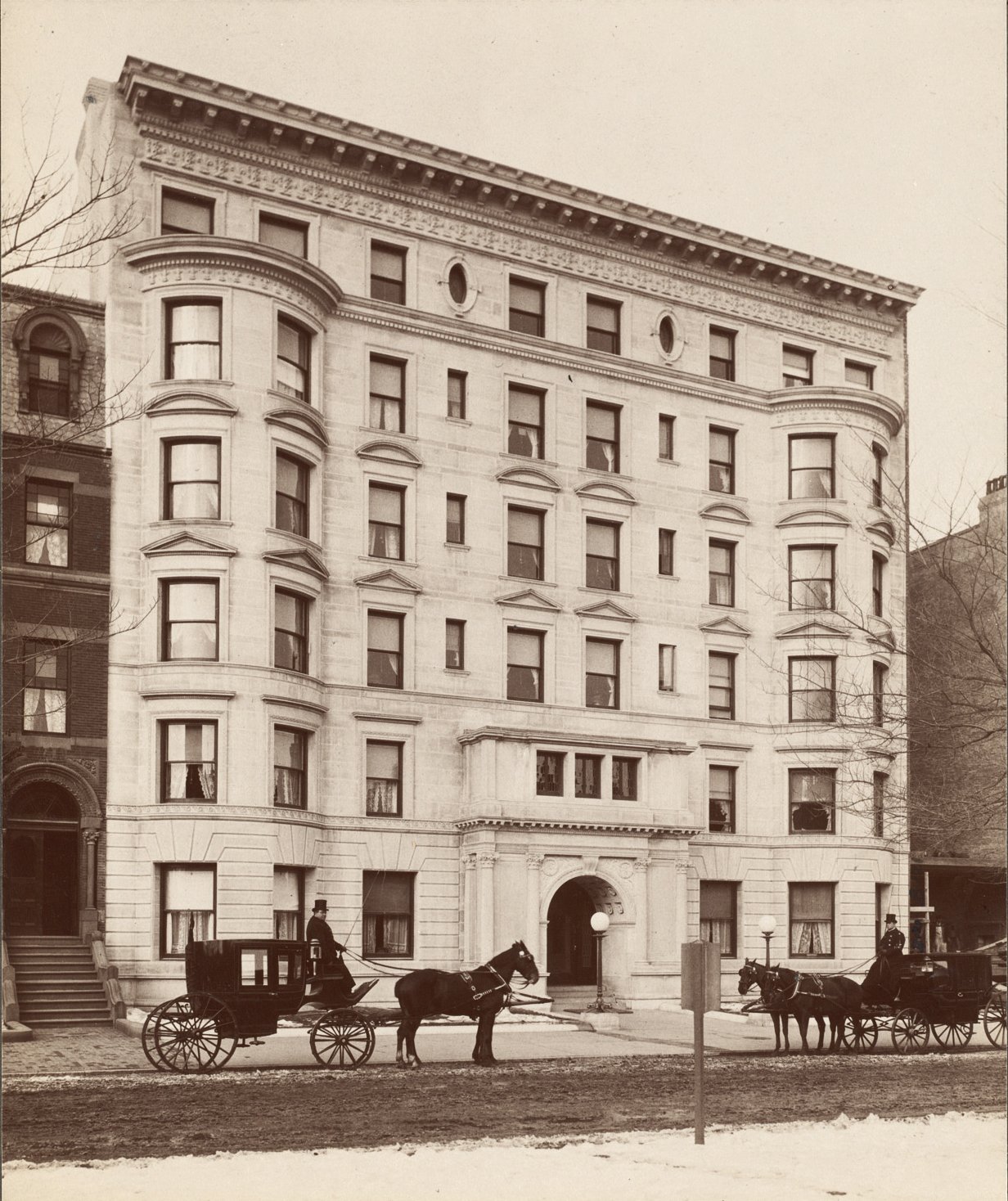 On January 19, 1895, the day after the Globe reported Henry S. Mackay’s purchase of the land at 331-335 Commonwealth, the Boston Evening Transcript described his plans to “erect a first-class family hotel, to be completed and ready for occupancy by the first of next September. The building will contain thirty apartments, ranging from two to twelve rooms to each suite. It will be fireproof and equipped with all improvements. The most prominent feature of the establishment will be the absence of housekeeping facilities from all the suites. The design of the architect is to have a large dining-room on the first floor, also a number of smaller dining-rooms adjoining, with kitchens and servants’ rooms in the basement.”