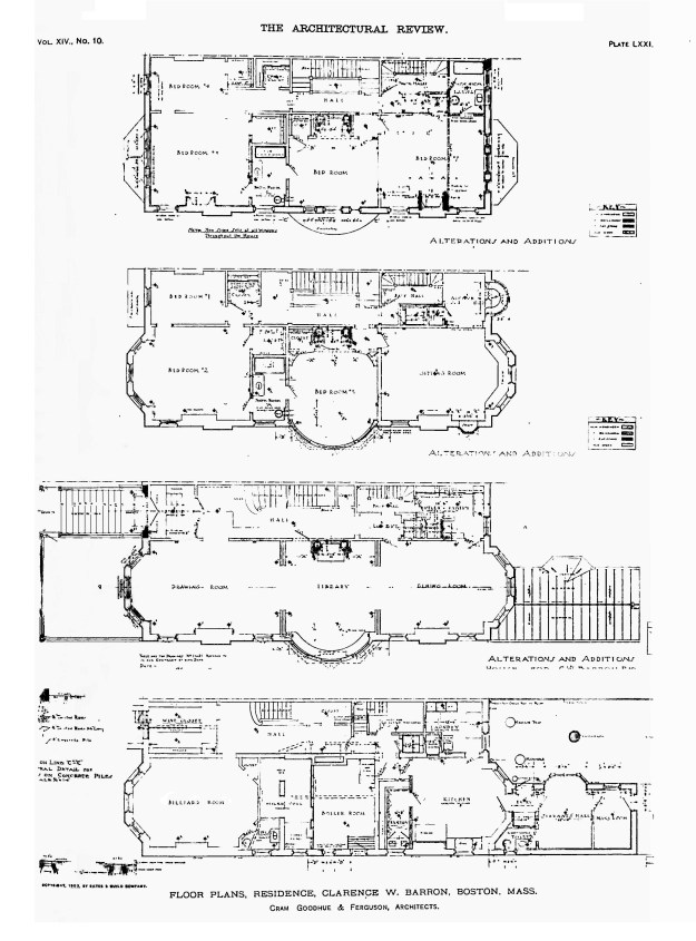 In March of 1905, 334 Beacon was purchased by Clarence Walker Barron, who had it extensively remodeled by the firm of Cram, Goodhue, and Ferguson, with the exterior resurfaced in cement plaster (stucco).