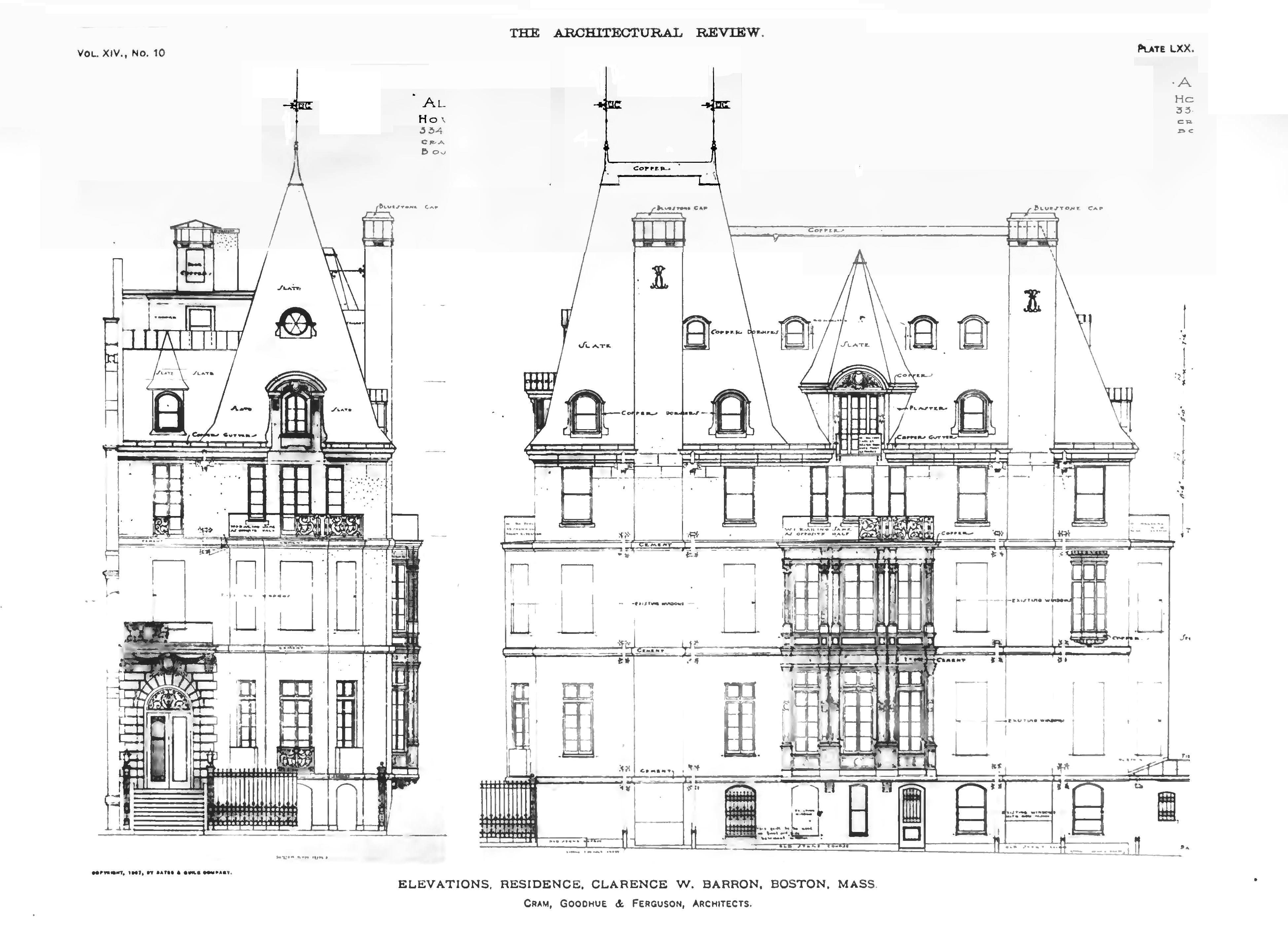 In March of 1905, 334 Beacon was purchased by Clarence Walker Barron, who had it extensively remodeled by the firm of Cram, Goodhue, and Ferguson, with the exterior resurfaced in cement plaster (stucco).