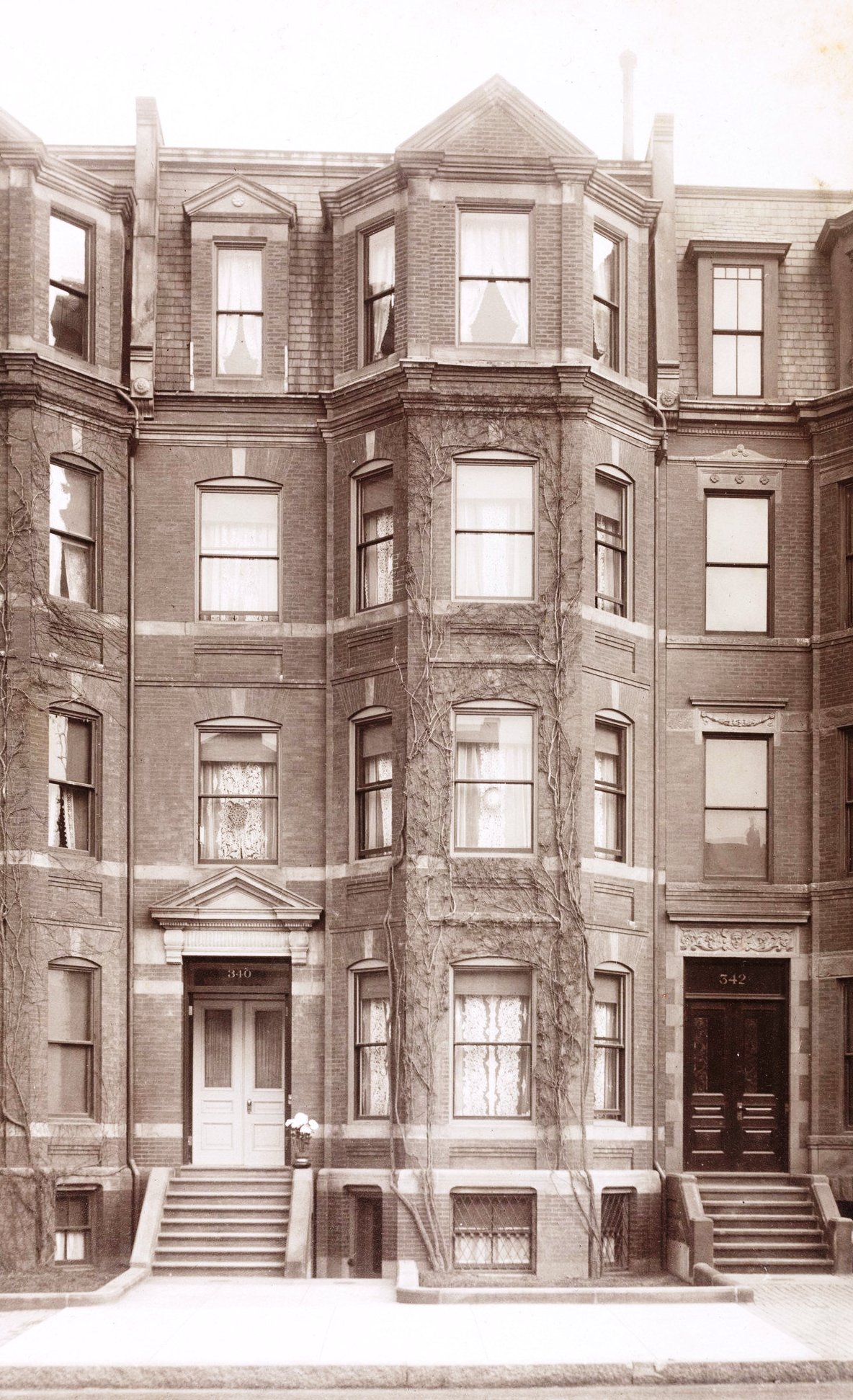340 Commonwealth was one of thirteen houses (336-360 Commonwealth) built for George Wheatland, Jr., by Warren D. Vinal and Charles A. Dodge on land owned by Charles Merriam and by Jacob Rogers. 336 Commonwealth was designed by George Avery, 338-340 Commonwealth were designed by Bradlee, Winslow, and Wetherell, and 342-360 Commonwealth were designed by Obed F. Smith.