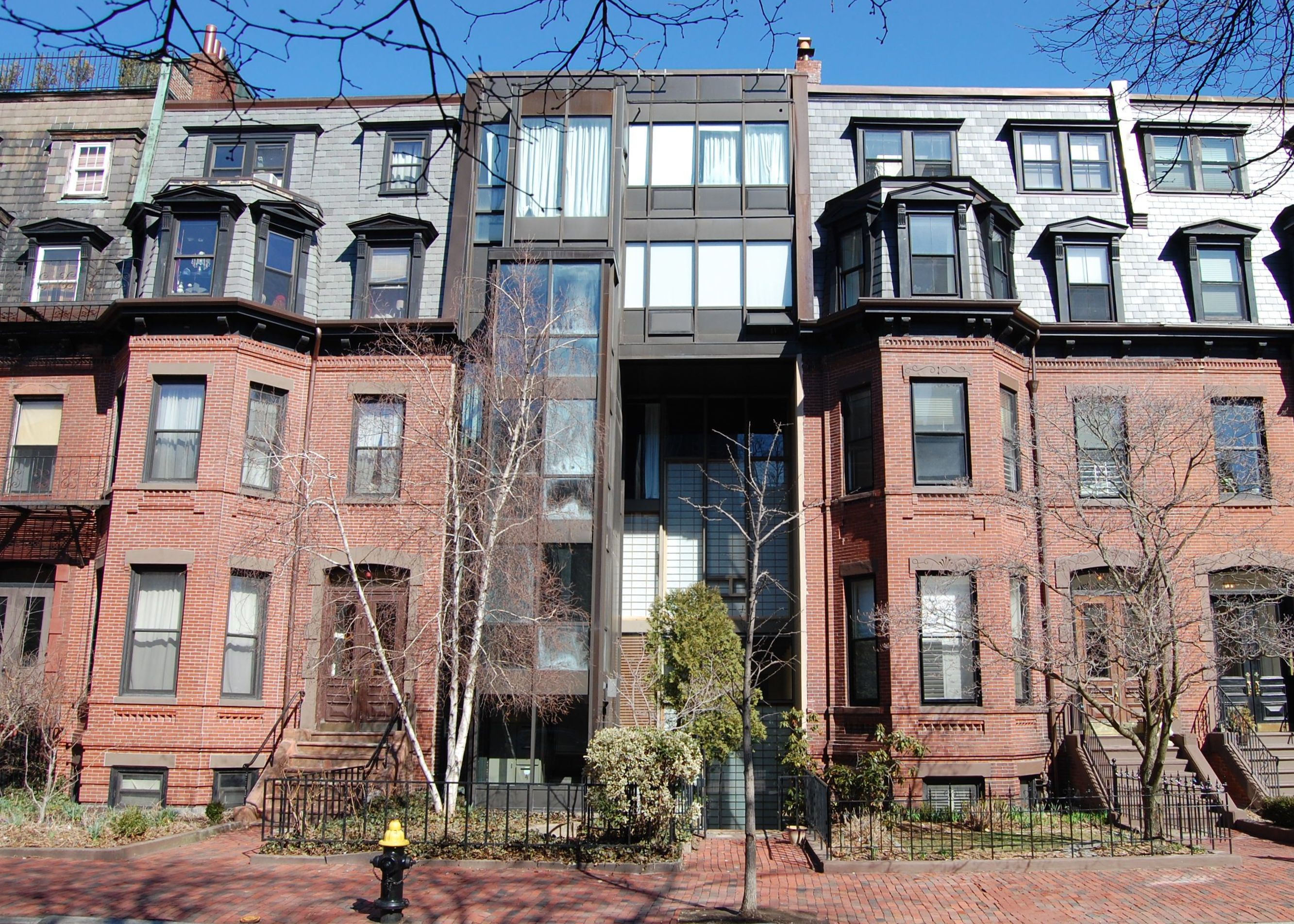 353 Marlborough was designed by Krokyn and Krokyn, architects, and built in 1958-1959 on a vacant lot where the original townhouse, built ca. 1871, had been demolished after being severely damaged by fire on May 7, 1935. The new house was built as a two-family dwelling using the foundation of original townhouse.