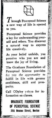 In October of 1957, Barclay Warburton sought to foreclose a mortgage he held on 355 Beacon. Ann Sutton Nichols obtained a temporary injunction, arguing that he owed her money and the checks he had given her were not honored by the bank. In the October 5, 1957, Boston Globe article on the proceedings, she was described as being the leader of “a ‘Perceptual Science’ cult” headquartered at 355 Beacon. Barclay Warburton’s attorney indicated that the payments he made to her were related to “‘the practice of law, medicine and psychiatry for which she is neither licensed nor qualified in practice,'” and that she had claimed that she “helped members of the group in talk with God.” The case was settled in December of 1957 in her favor, with the litigants agreeing to cancel the mortgage.