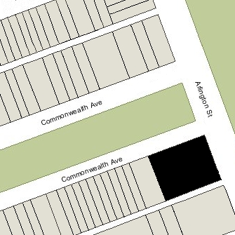 2 Commonwealth is located on the SW corner of Arlington and Commonwealth, with 1 Commonwealth (12 Arlington) to the north, across Commonwealth, 15 Arlington to the south, across Alley 437, and 12 Commonwealth to the west.
