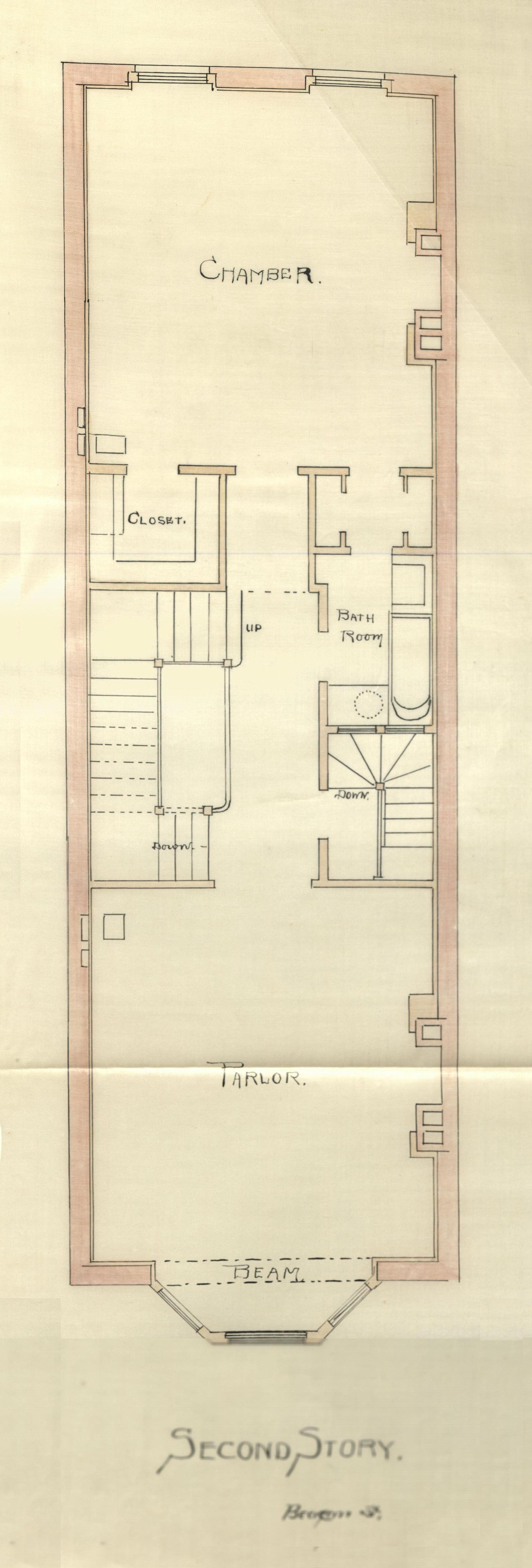 Second floor plan of 359 Beacon, bound with the final building inspection report , 13Nov1886 (v. 16, p. 58); Boston City Archives