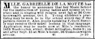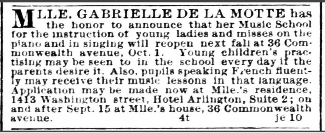 During the 1885-1886 winter season, 36 Commonwealth was the home of Mlle. Gabrielle de la Motte. She was a music teacher and maintained a school for “young ladies and misses” at the house. She also was director of the Sanctuary Choir at the Catholic Cathedral of the Holy Cross on Washington Street. She previously had lived at 9 Malden and then briefly at the Hotel Arlington at 1413 Washington. In October of 1886, she moved her music school to 134 Boylston (later renumbered 380 Boylston) and resumed living at 9 Malden. A January 31, 1887, Boston Evening Transcript announcement observed that the location on Boylston “is as central as its former one on Commonwealth Avenue, and is more convenient in stormy weather.” It also noted that “Mlle. de la Motte is a pupil of Chopin. A pupil of Chopin is a rare person and Boston young ladies should not be ignorant of the fact.”