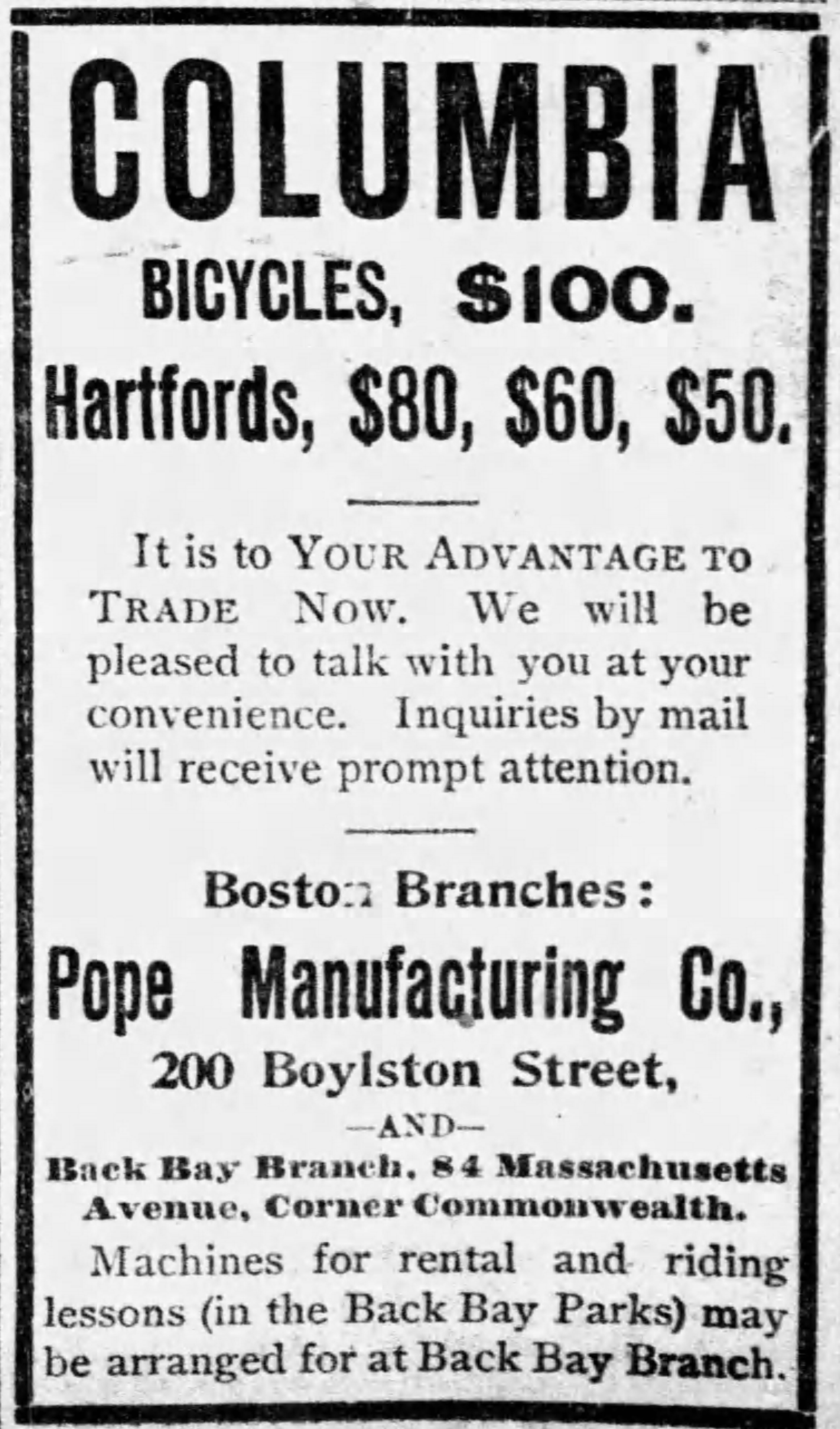 Also among the early businesses at 366 Commonwealth was the Back Bay branch of the Pope Manufacturing Company, makers of the Columbia and Hartford bicycles. The shop was located at 84 Massachusetts from about 1896 and offered both bicycle rentals and riding instruction. The company’s owner, Col. Albert Augustus Pope, and his wife, Abbie (Linder) Pope, lived at 378 Commonwealth; the bicycles were manufactured at 221 Columbus.