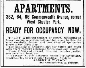 In September of 1890, an advertisement in the Boston Evening Transcript by Albert S. Watson offered 419 West Chester Park (86 Massachusetts Avenue) as a “large, well-lighted store, splendid location and admirably fitted for first-class caterer’s business,” and 417 West Chester Park (88 Massachusetts Avenue) as a “large store, good light, suitable for jewelry business or fancy stationery” which could be leased “with permission to sublet part.”
