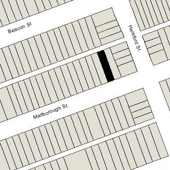 On October 9, 1879, George Wheatland, Jr., purchased the land to the west, with a 80.58 foot frontage, from Grenville T. W. Braman, and subsequently transferred the lot to his father. The 80.58 foot parcel originally had been intersected by Parker Street, a 60 foot wide street located on top of the Cross Dam, which ran southwest from Beacon at approximately a 45 degree angle, intersecting the north side of Marlborough at a point about 355 feet west of Hereford. Grenville Braman had purchased the eastern portion of the lot from Daniel Davies on October 1, 1872, a triangular lot bounded on the west by Parker Street. In the late 1870s, Parker Street was abandoned and, through a series of transactions, Grenville Braman purchased the land under the roadway, another triangular parcel which he combined with the first to create the rectangular lot he then sold to George Wheatland, Jr.