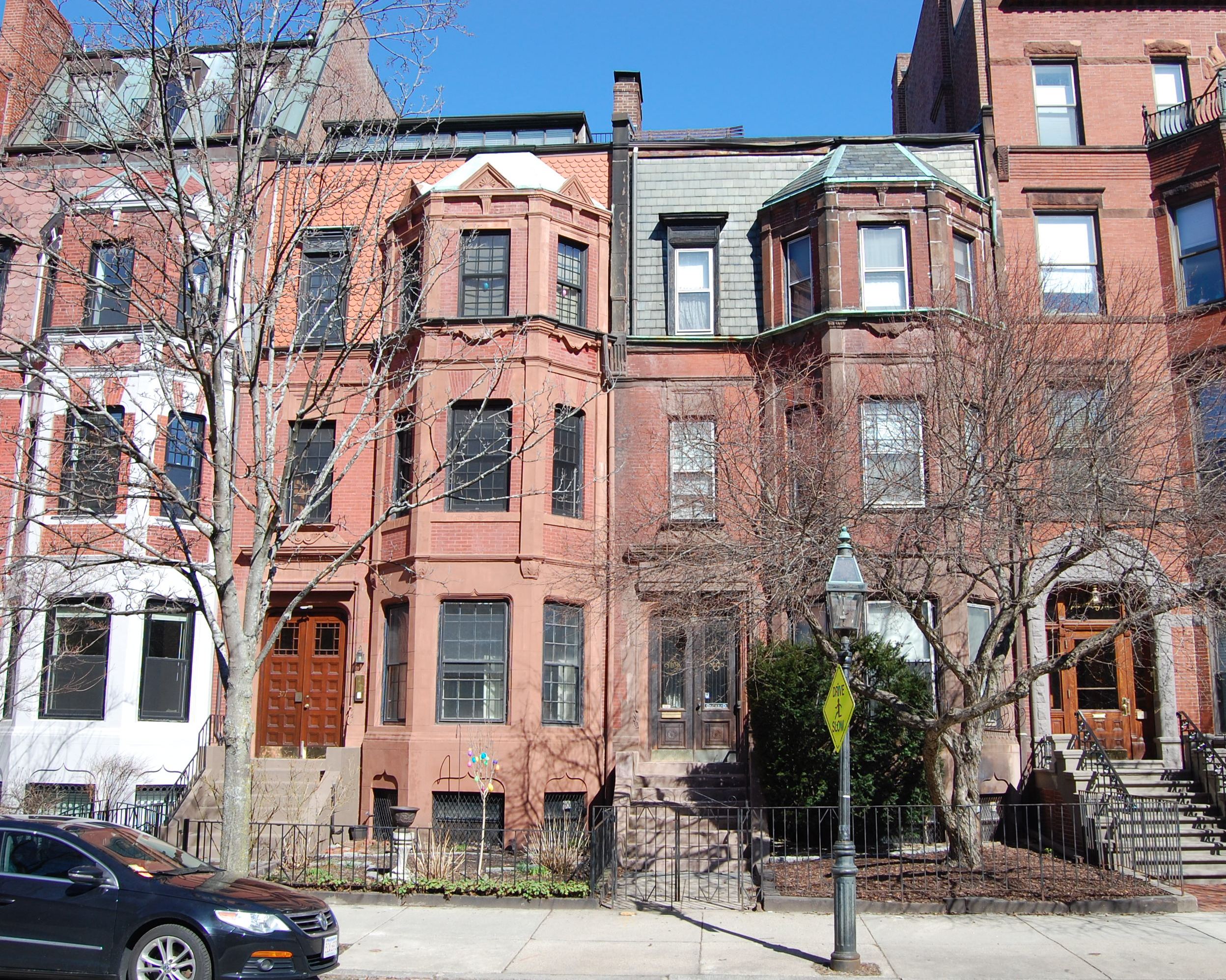 The houses were built in three groups: three at 369-371-373 Marlborough in 1879-1880, three at 375-377-379 Marlborough in 1880, and six at 381-383-385-387-389-391 Marlborough in 1880-1881. The six at 369-379 Marlborough are of the same design, and the six at 381-391 Marlborough also are of the same design as each other and quite similar to the six at 369-379 Marlborough.