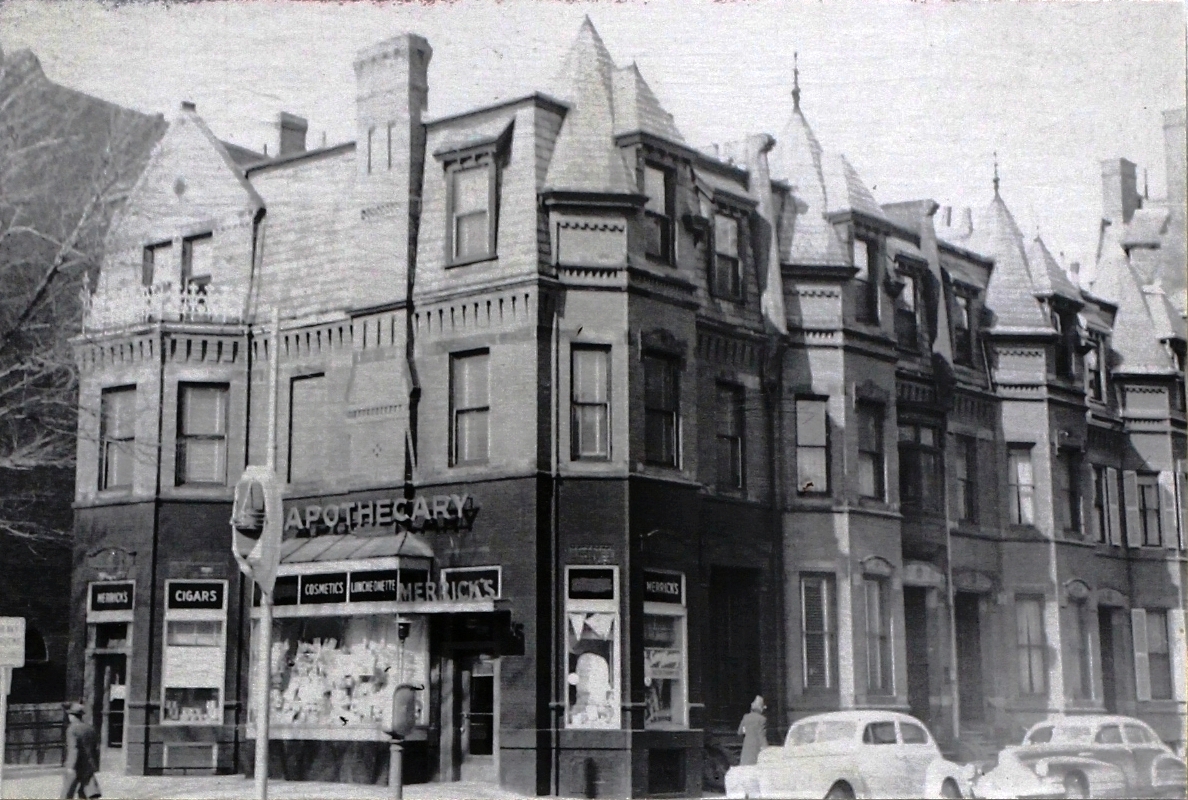 By 1940, John E. Merrick had opened a pharmacy in the new store, with the address of 239 Newbury. He also lived in one of the two apartments. He previously had lived at 72 Linden. He continued to live and maintain his store at 37 Fairfield/239 Newbury in 1941