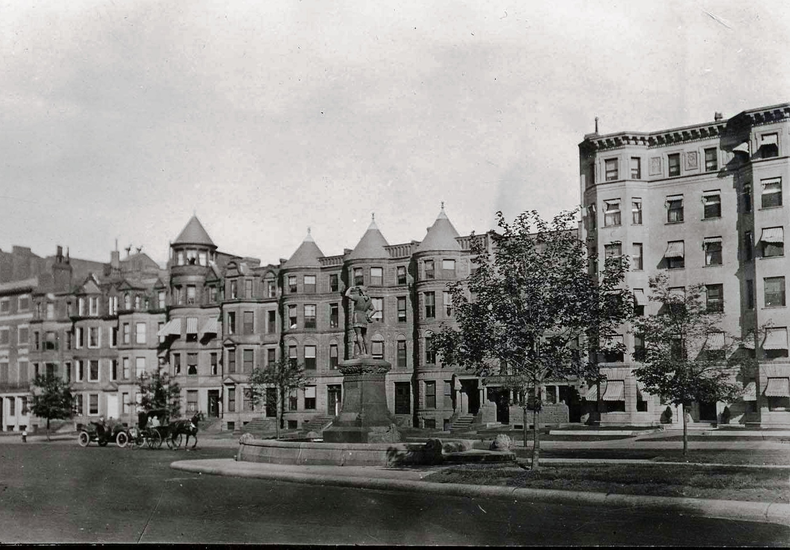 As originally laid out, the portion of Commonwealth between Massachusetts Avenue and Charlesgate East had a curved roadway intended to provide a transition from the formal design of the preceding blocks to the parklands in the Back Bay fens. It was divided into uneven islands and included a strip of green space in front of 371-387 Commonwealth and a small triangular island at the eastern end on which the statue of Leif Ericson (Erikson) was located (dedicated in 1887).