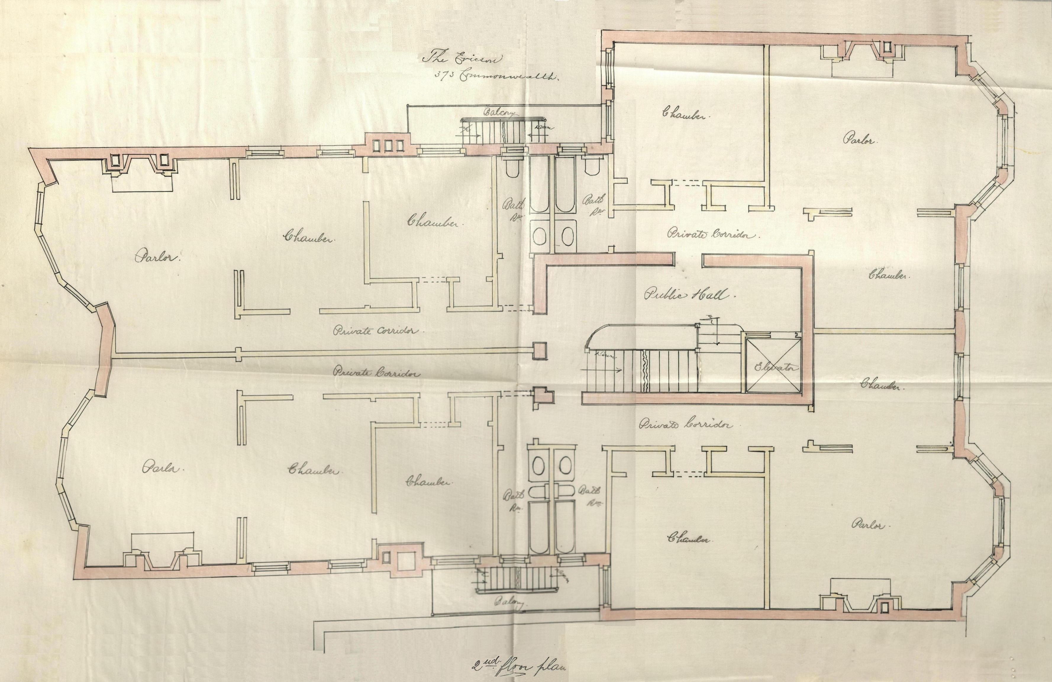 Second floor plan of 373 Commonwealth, bound with the final building inspection report, 27Jan1895 (v. 59, p. 142); Boston City Archives