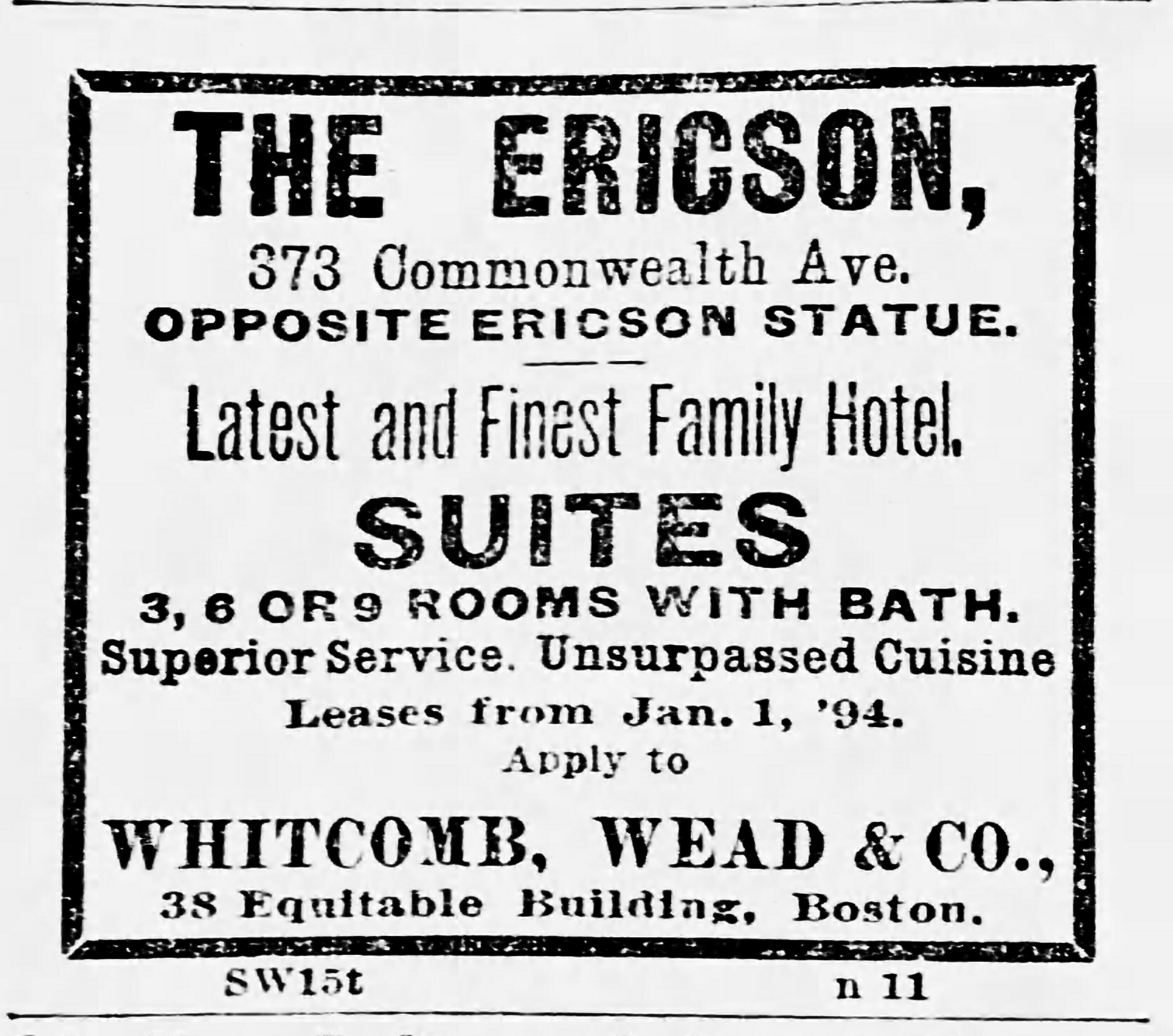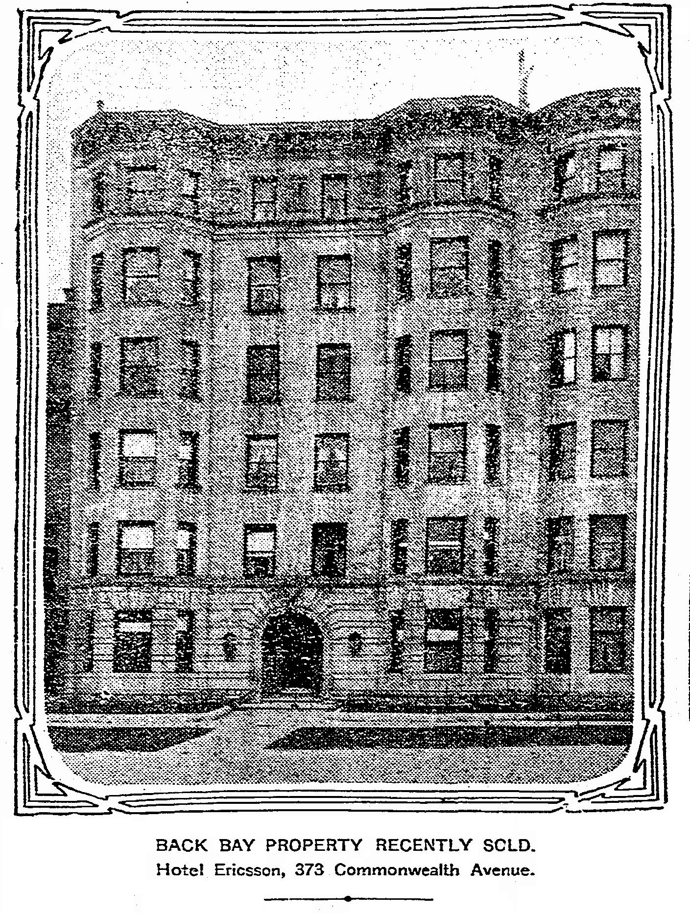 From mid-1902, the Hotel Ericson was managed by Frank C. Hall. He and his wife, Alwildia (Chase) Hall, lived at 373 Commonwealth. He continued as manager until mid-1905, when he became manager of the Somerset Hotel.