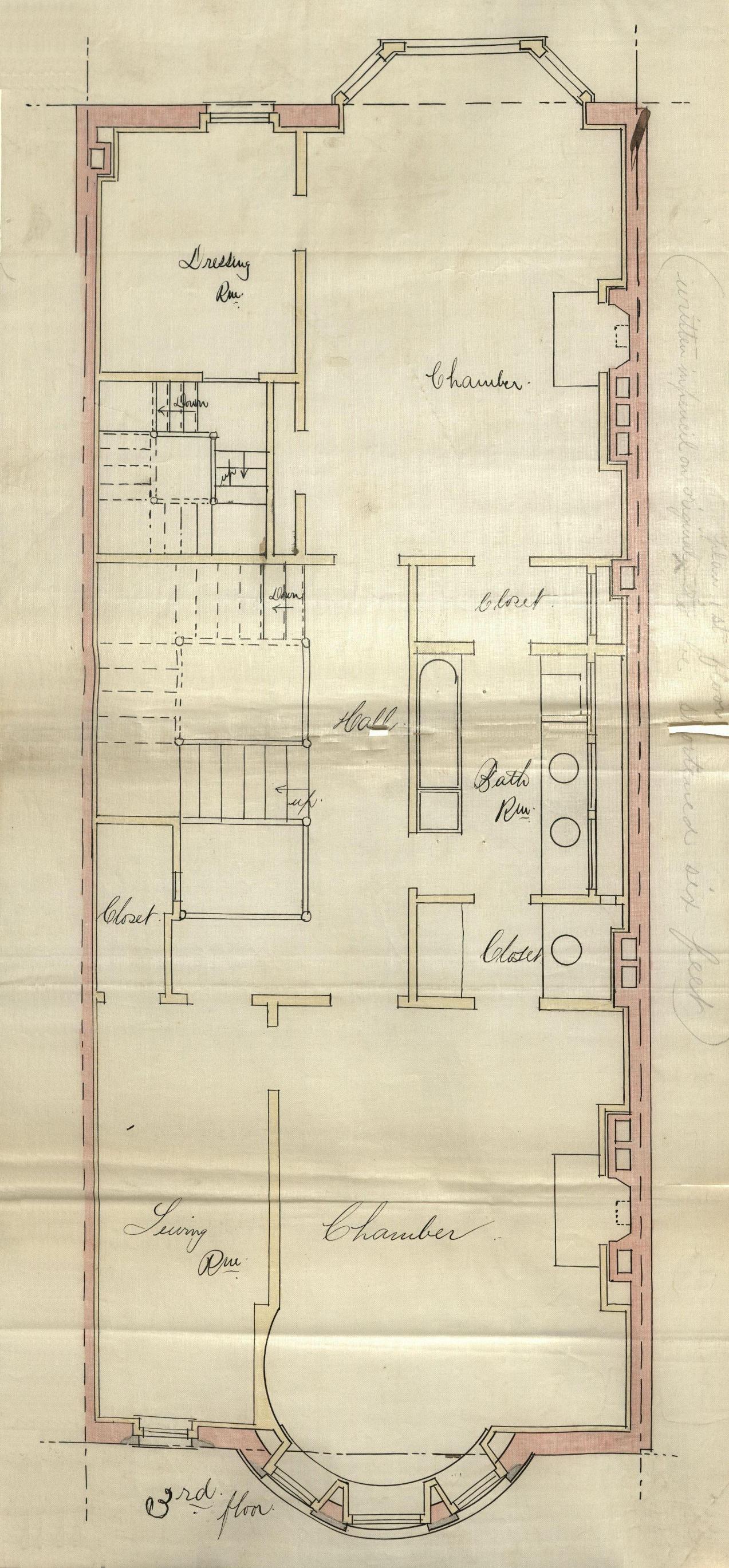 Third floor plan of 375 Commonwealth, bound with the final building inspection report, 1May1893 (v. 52, p. 78); Boston City Archives