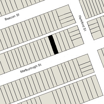 On October 9, 1879, George Wheatland, Jr., purchased the land to the west, with a 80.58 foot frontage, from Grenville T. W. Braman, and subsequently transferred the lot to his father. The 80.58 foot parcel originally had been intersected by Parker Street, a 60 foot wide street located on top of the Cross Dam, which ran southwest from Beacon at approximately a 45 degree angle, intersecting the north side of Marlborough at a point about 355 feet west of Hereford. Grenville Braman had purchased the eastern portion of the lot from Daniel Davies on October 1, 1872, a triangular lot bounded on the west by Parker Street. In the late 1870s, Parker Street was abandoned and, through a series of transactions, Grenville Braman purchased the land under the roadway, another triangular parcel which he combined with the first to create the rectangular lot he then sold to George Wheatland, Jr.