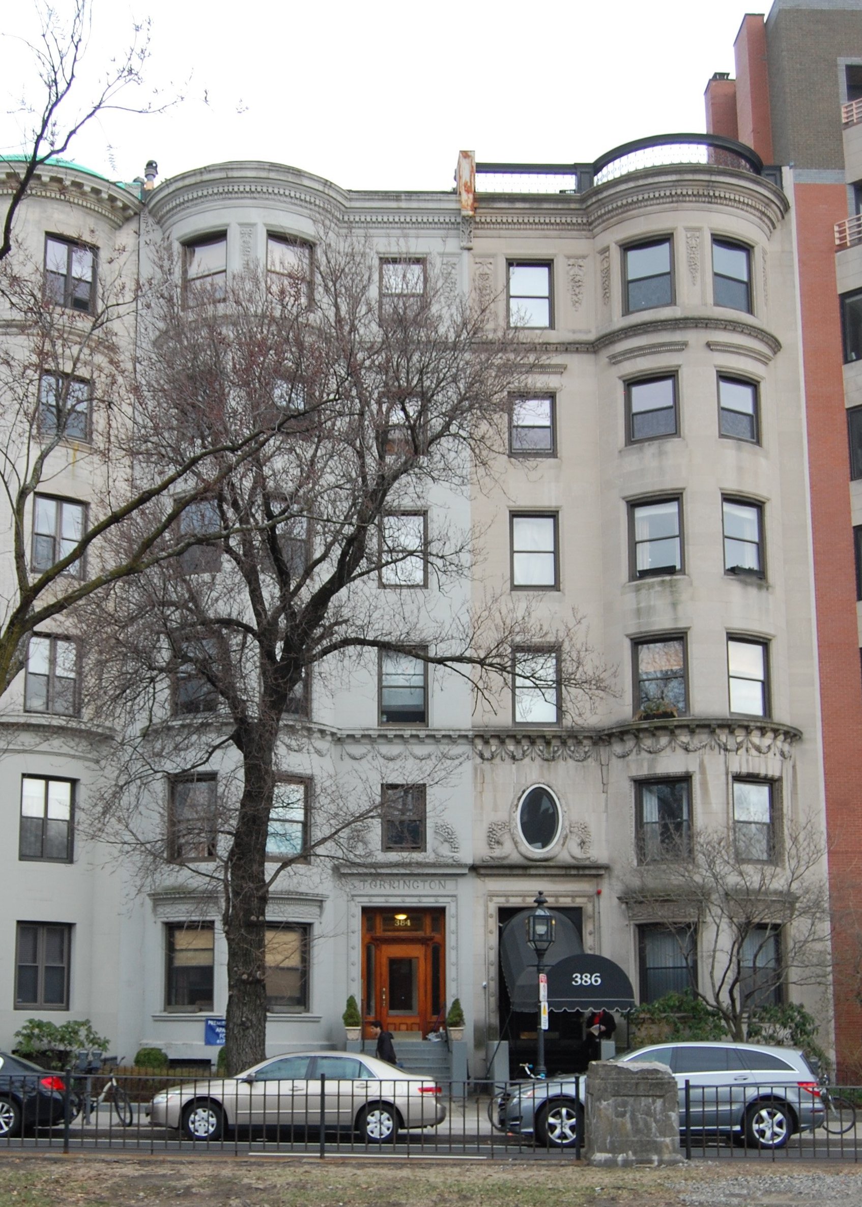 384 Commonwealth was first listed, as The Torrington, in the 1898 Blue Book. After 386 Commonwealth was completed in 1900, the two buildings were listed together as The Torrington, starting with the1901 Blue Book. They continued to be listed in that manner, implying that they were operated as one apartment house, through the last Blue Book in 1937. However, they were separately owned from 1902, when the Proprietors of Mount Auburn Cemetery foreclosed on a mortgage given by George Ridgway and took possession of 384 Commonwealth.
