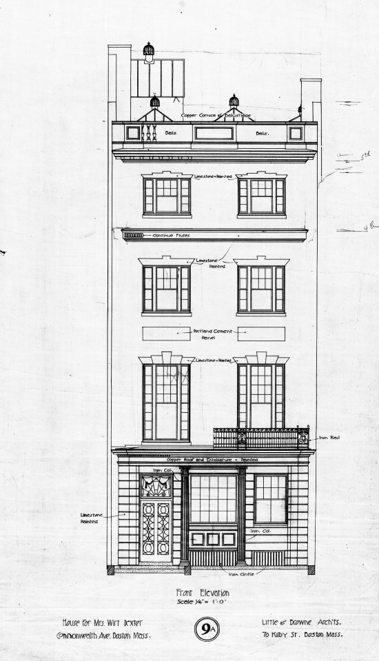 Comm 393 – Front Elevation – Hist NE Scan ← Previous Next → Front elevation of 393 Commonwealth drawn ca. 1899 by Little and Browne; courtesy of Historic New England