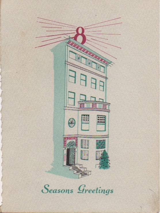 Drawing of 395 Commonwealth; 1956 Christmas card from the Hearthstone Insurance Company, from the collections of Helen and Dante “Joe” Balboni