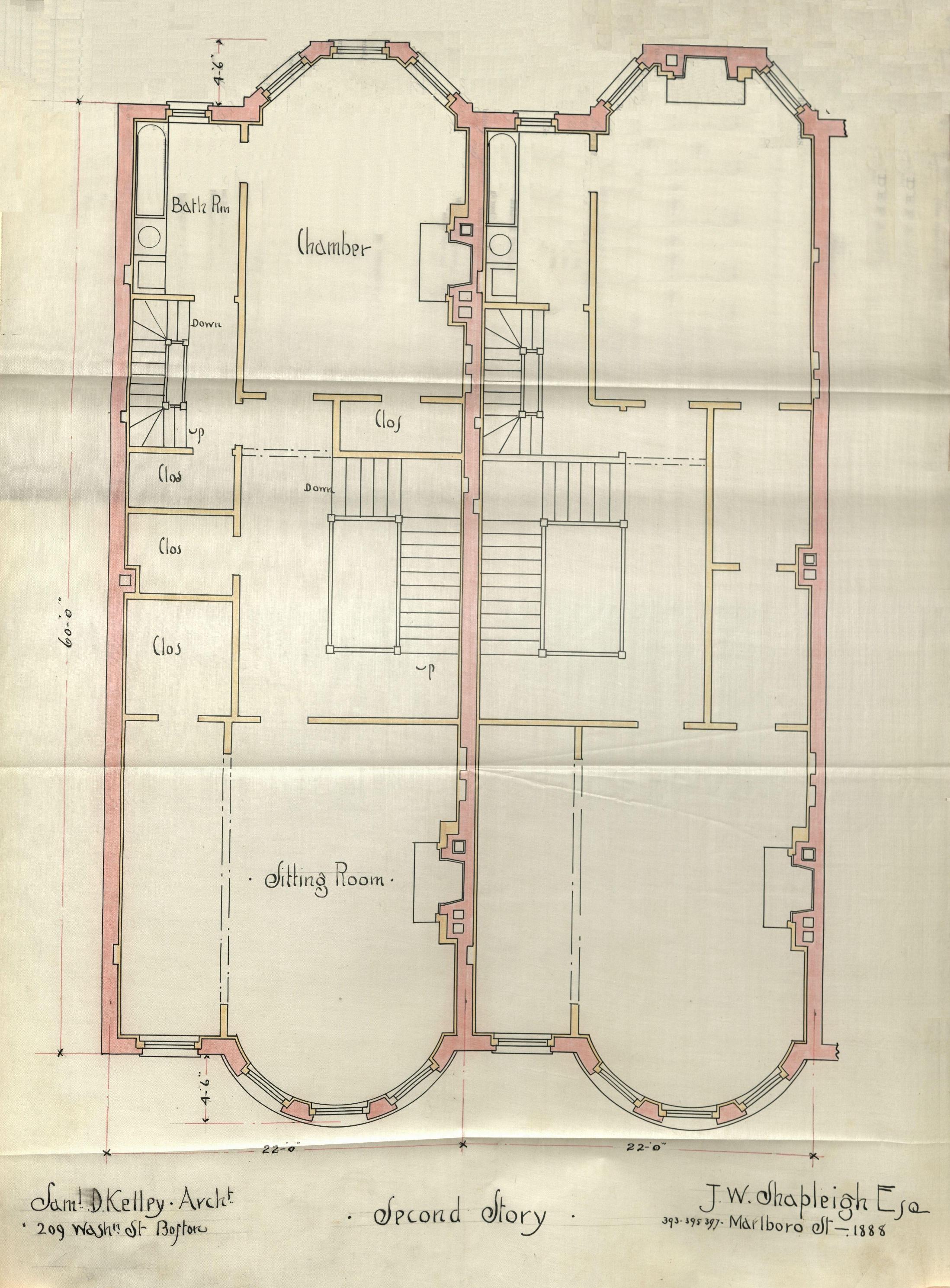 In his Houses of Boston’s Back Bay, Bainbridge Bunting erroneously states that 393-395-397 Marlborough were built in 1883. In fact, the land for the houses was not purchased by John Shapleigh until late 1887 and the original building permit applications for all three houses were filed in 1888. Bunting also does not attribute the buildings to a specific architect. However, the final building inspection report for 393 Marlborough indicates the architect was Samuel D. Kelley and includes a floor plan for the second floor labeled “383-395-397 Marlboro St – 1888” signed by Samuel Kelley.