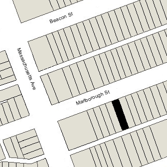 398 Marlborough is located on the south side of Marlborough, between Hereford and Massachusetts Avenue, with 396 Marlborough to the east and 400 Marlborough to the west.