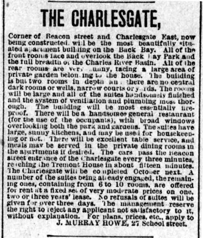 ChgE 004 – 1891-03-27 – Boston Post ← Previous Next → Advertisement for The Charlesgate, under construction; Boston Post, 27Mar1891