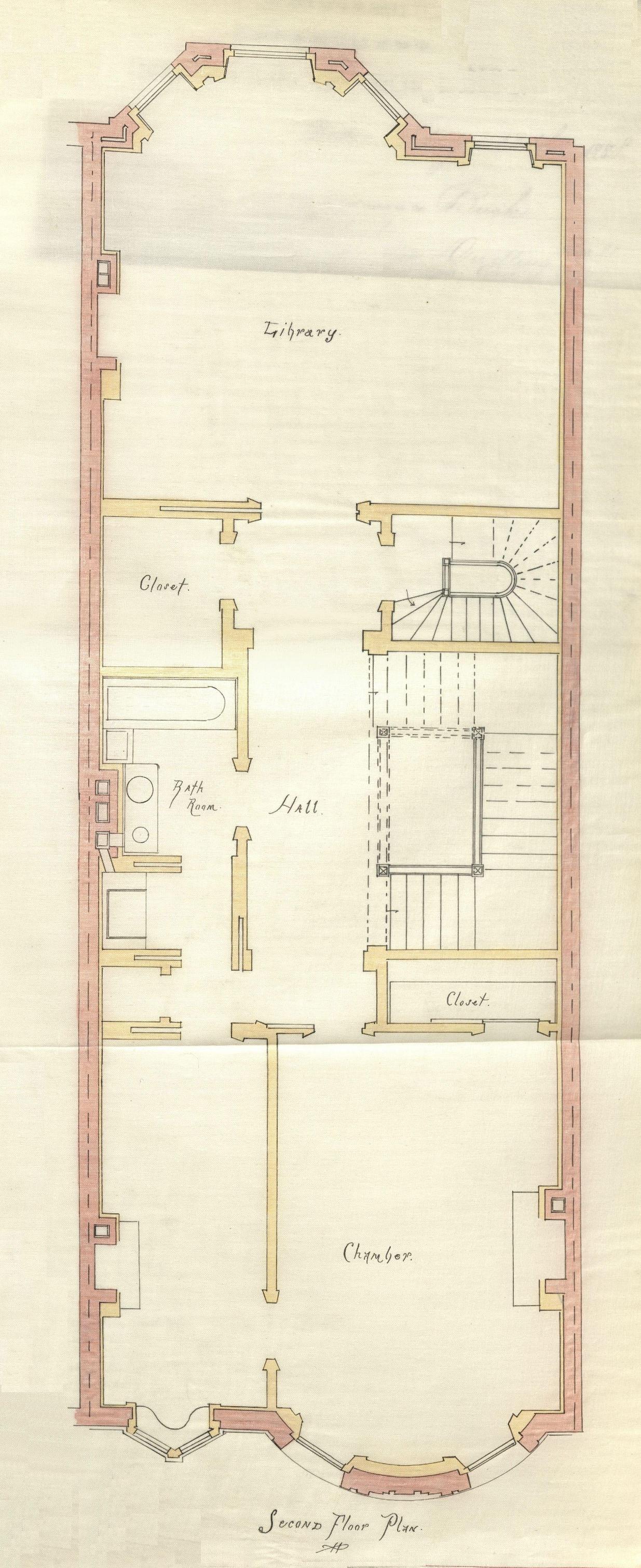 Second floor plan of 406 Beacon, bound with the final building inspection report, 13Aug1888 (v. 24, p. 83); Boston City Archives