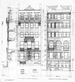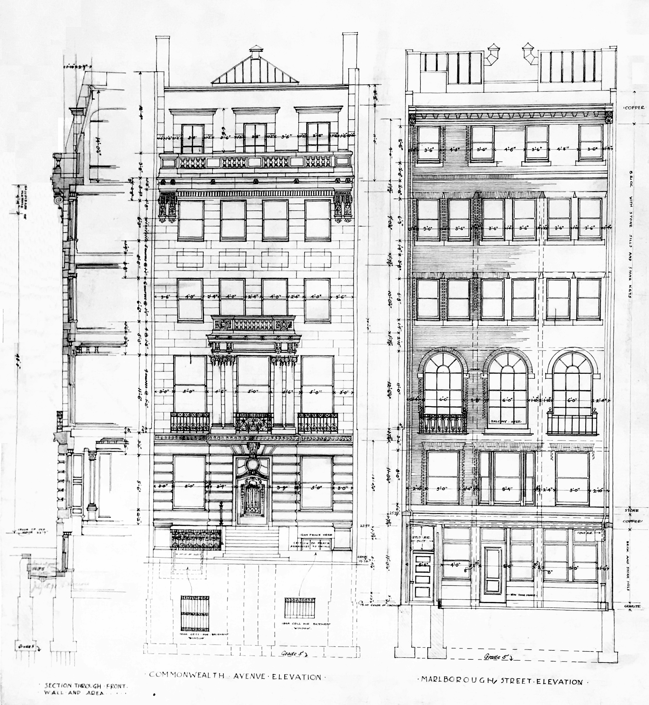 409 Commonwealth, front and rear (Marlborough Street) elevations, excerpt from drawings by Peabody and Stearns (1898); courtesy of the Boston Public Library Arts Department