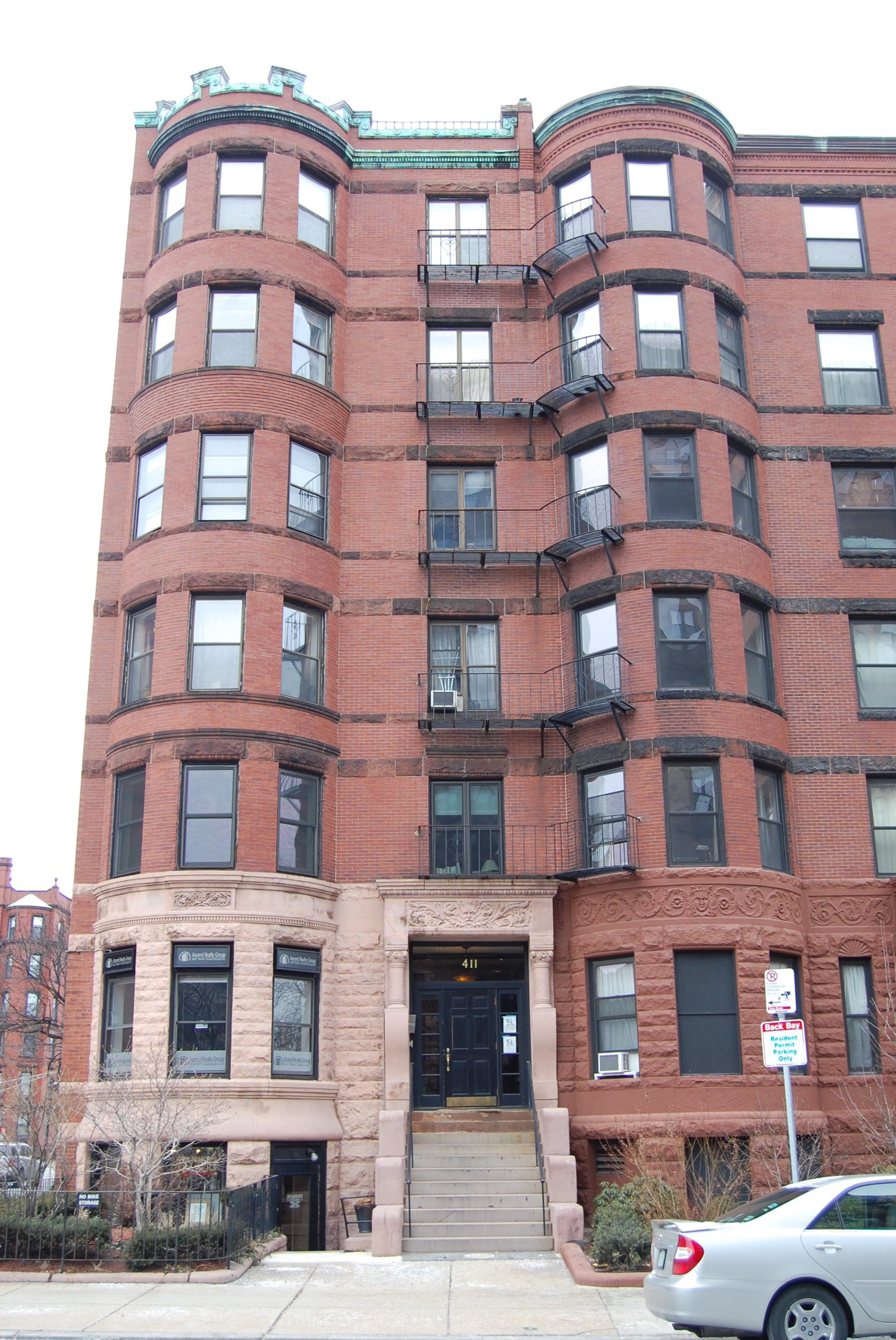 411 Marlborough, a six-unit apartment building, was designed by architect Samuel D. Kelley and built in 1890-1891 by Keening & Strout Brothers, masons, for jeweler and real estate developer Edwin B. Horn, Jr. It was a companion building to 409 Marlborough, a twelve-unit building built at the same time, and to 405-407 Marlborough, two six-unit buildings built for Edwin Horn in 1889.