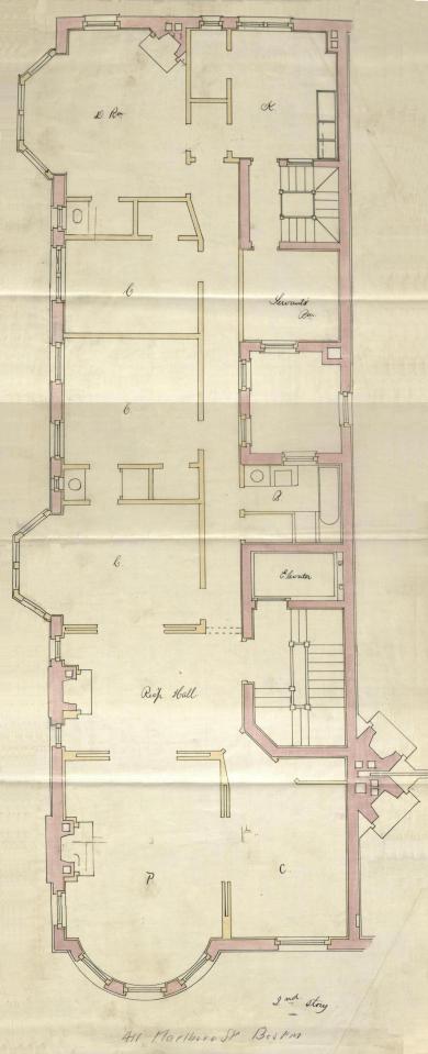 Marl 411 – Second Floor Plan (1891) ← Previous Second floor plan of 411 Marlborough, bound with the final building inspection report, 21Oct1891 (v. 41, p. 52); courtesy of the Boston Public Library Arts Department
