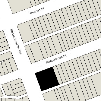 416 Marlborough is located on the SE corner of Marlborough and Massachusetts Avenue, with 406 Marlborough to the east, 424 Marlborough to the west, across Mass. Ave., 411 Marlborough to the north, across Marlborough, and 355 Commonwealth to the south, across Alley 429.