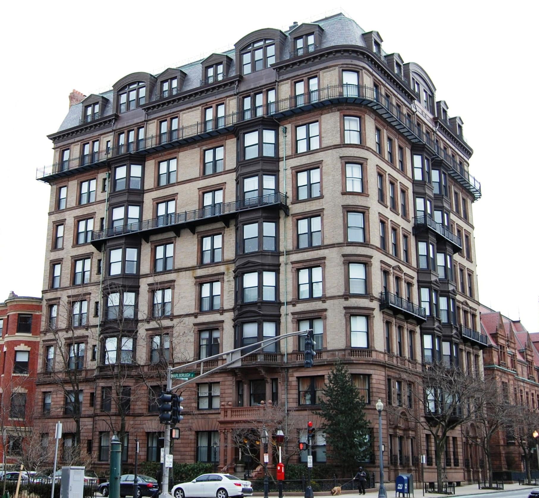 On November 27, 1895, as the building was under construction, the Boston Herald reported that it would be “the largest fireproof family apartment house” in Boston. It noted that “all of the suites are arranged for housekeeping, with kitchens and servants’ rooms connected on the same floor. Every room and all the windows face upon the open air, and the rooms will be warmed by hot water. Each suite is supplied with hot and cold water from exposed plumbing, and is lighted by electric and gas lights. An important feature is the furniture elevators connecting each suite directly with the central court yard and rear driveways, allowing furniture and packages to be taken to and from the wagons without being carried through the house corridors and stairways.”