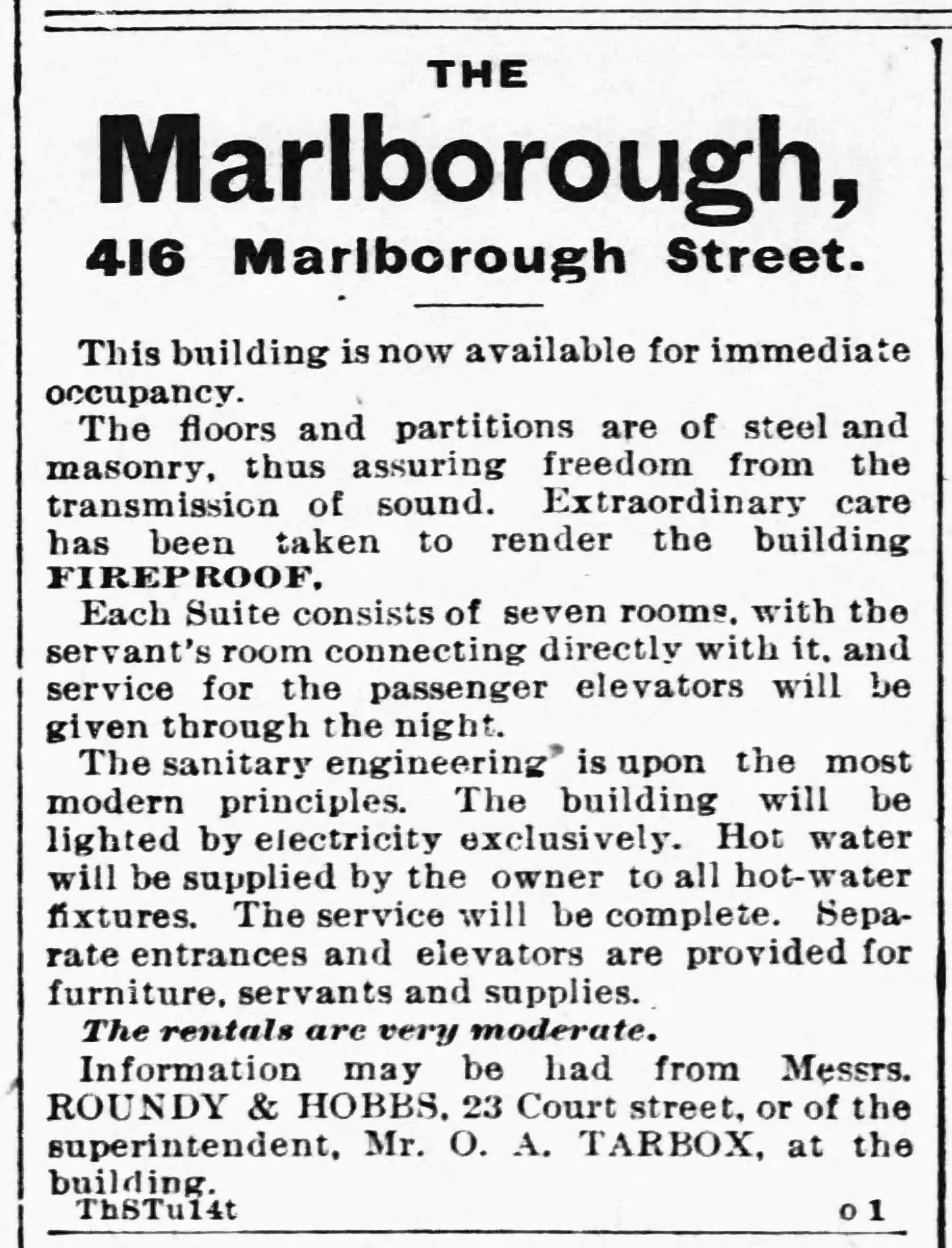 The Marlborough was completed in mid-1896, and on September 2, 1896, the Boston Evening Transcript described to the building in some detail. The first residents had taken up occupancy by the 1896-1897 winter season.