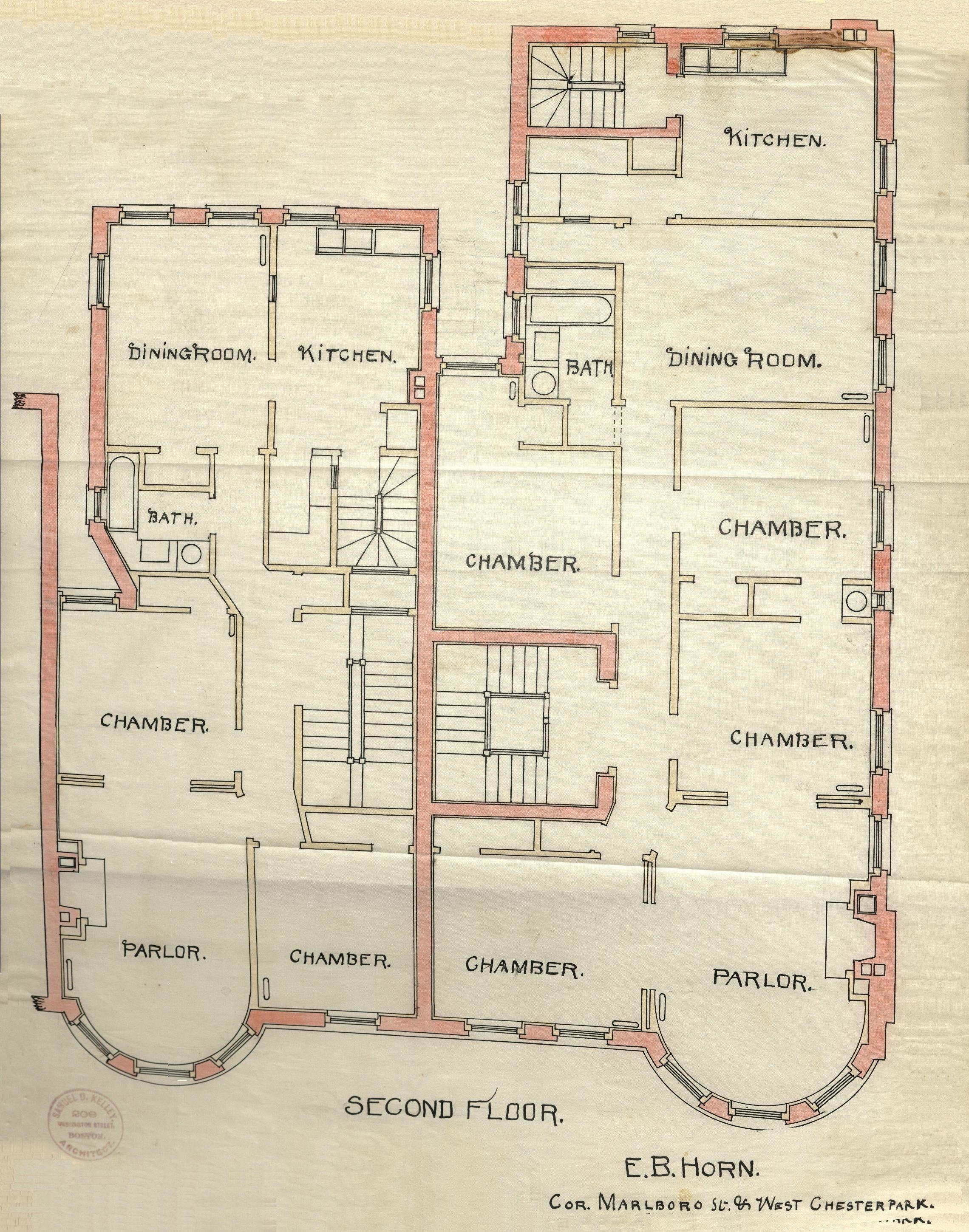 Second floor plan of 421-423 Marlborough, bound with the final building inspection report for 421 Marlborough, 27May1890 (v. 35, p. 24); Boston City Archives
