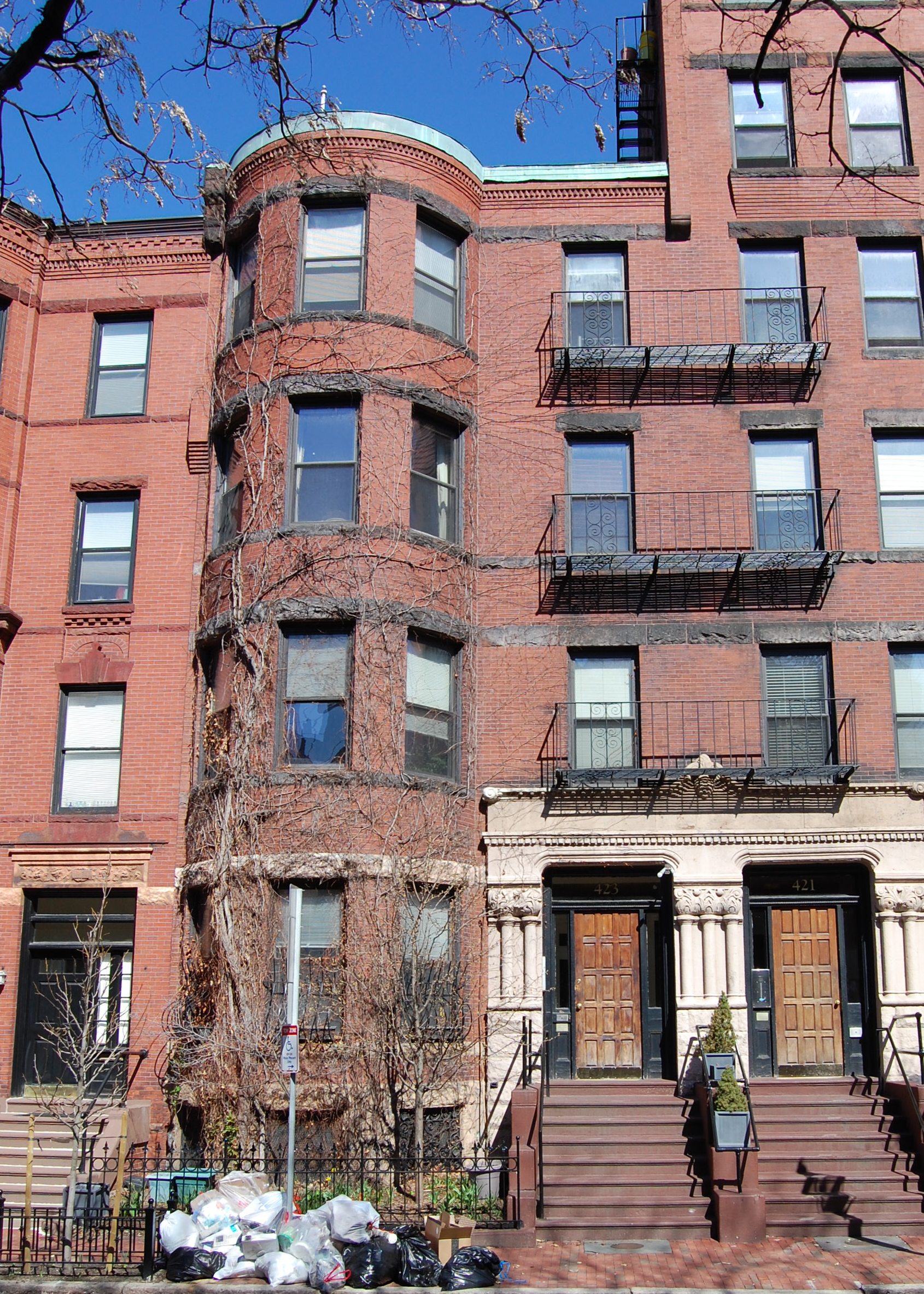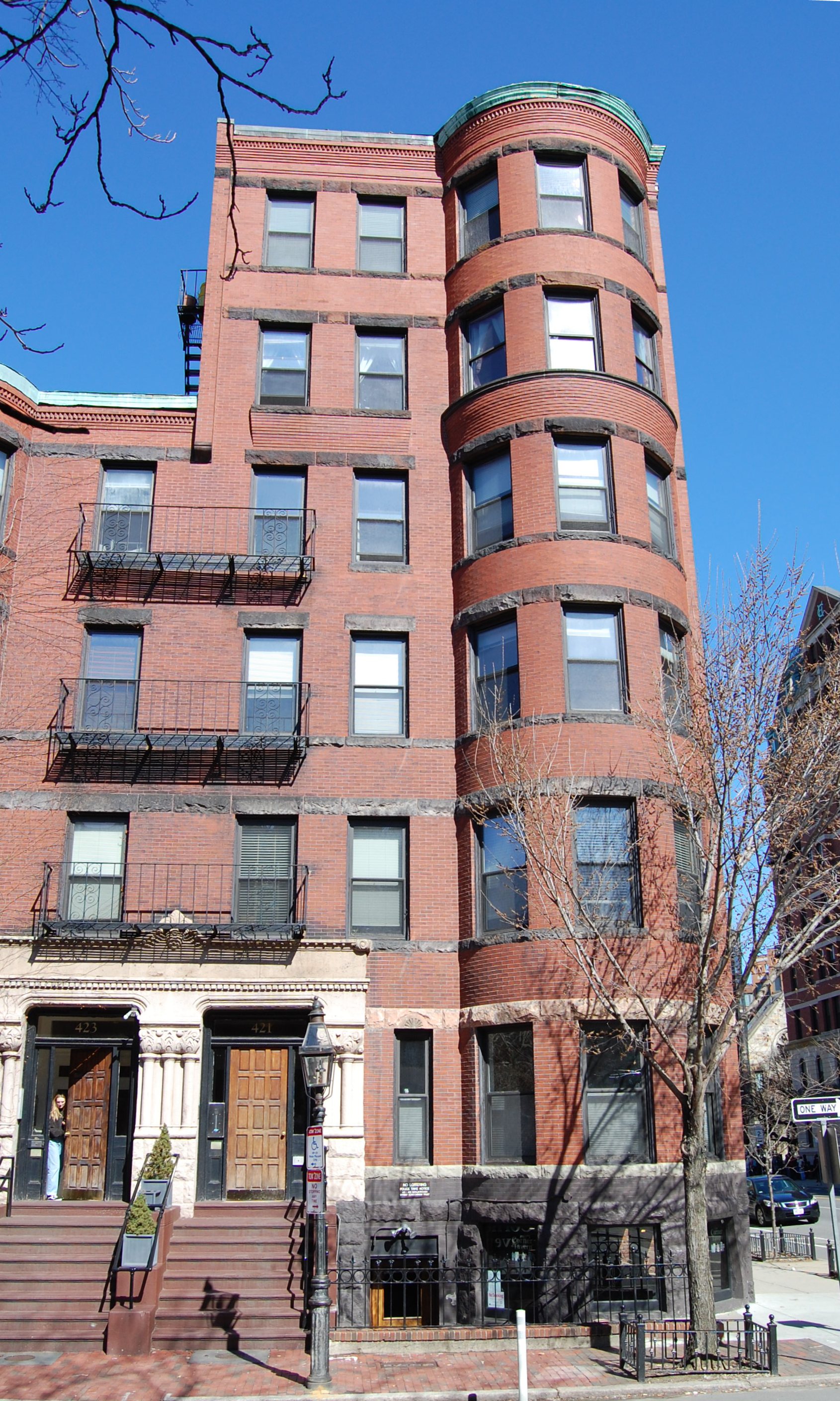 421-423 Marlborough (33-35 Massachusetts) are located on the NW corner of Marlborough and Massachusetts Avenue, with 411 Marlborough to the east, across Massachusetts Avenue, 425 Marlborough to the west, 31 Massachusetts to the north, and 424 Marlborough to the south, across Marlborough.
