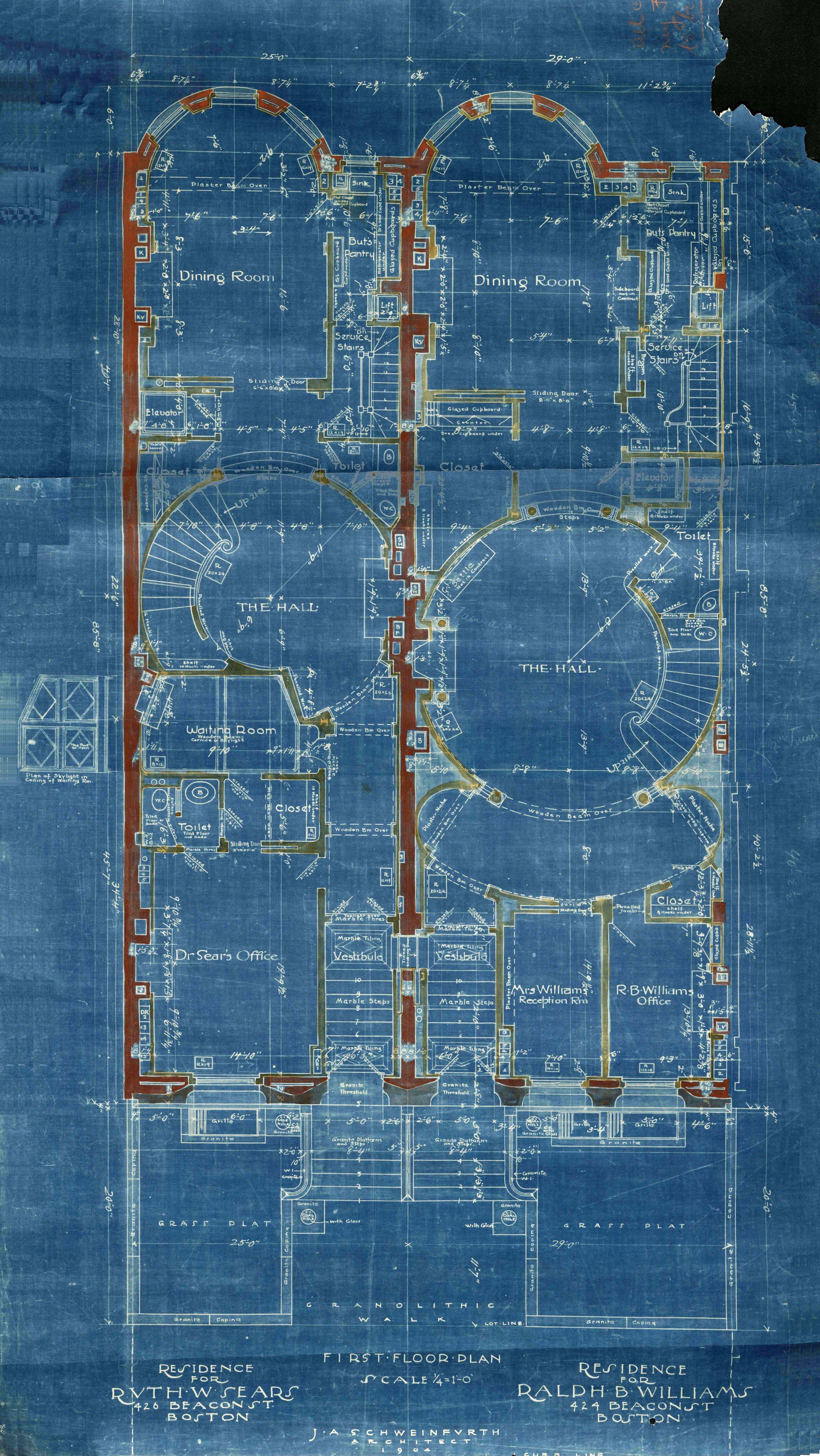 Blueprint of the first floor of 424-426 Beacon (1904), by architect Julius A. Schweinfurth; courtesy of the Boston City Archives, City of Boston Blueprints Collection