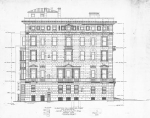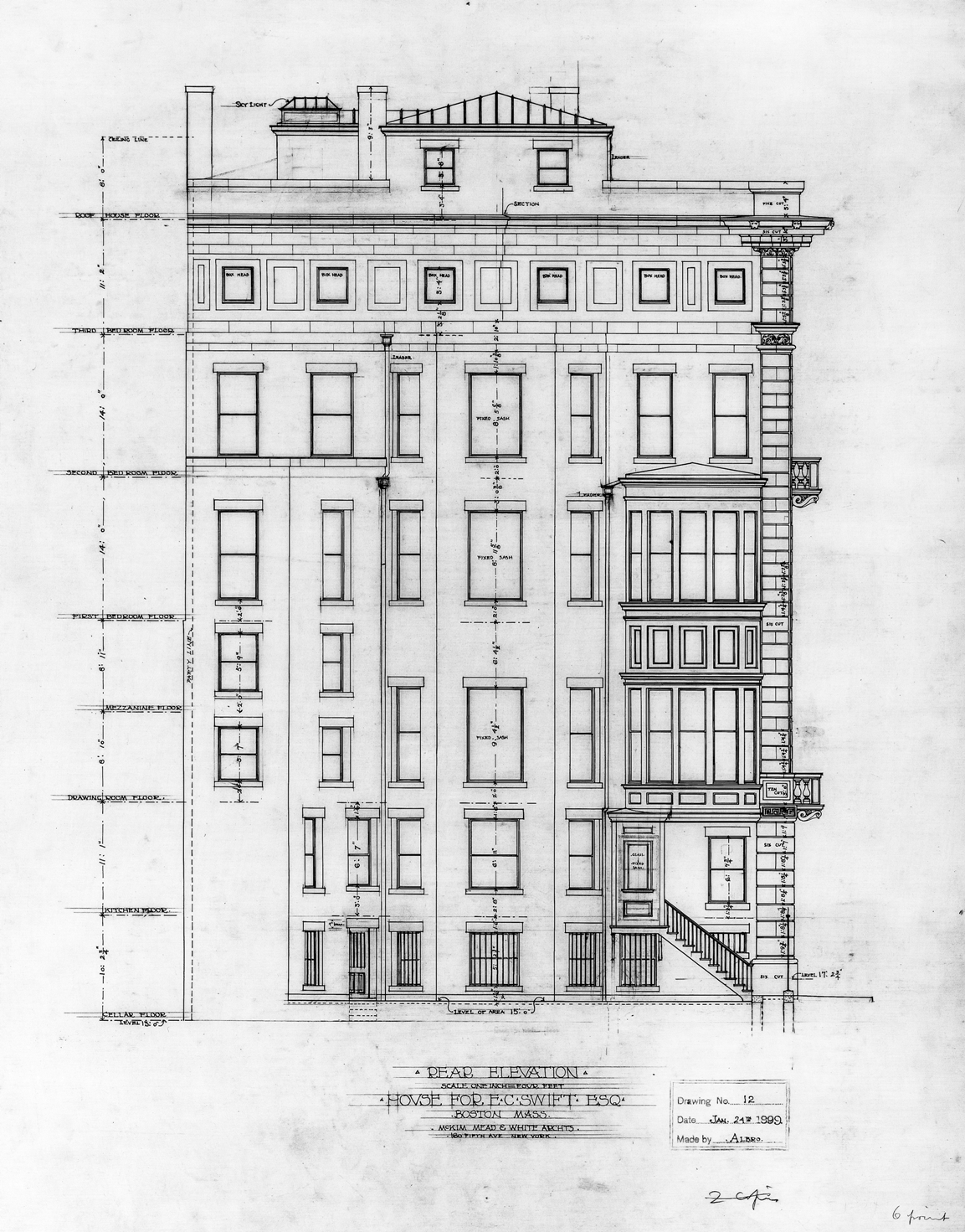 On November 20, 1898, the Table Gossip column in the Boston Globe commented that the Swifts had cancelled plans to spend the winter season in Europe because they were planning to build “a new residence on the lower part of Beacon st, which Mr. Swift will have built this season.” March 9, 1899, the Boston Evening Transcript reported that the Board of Health had held a hearing on Edwin Swift’s petition for a brick stable at 428 Beacon and that no opposition was expressed. And on April 1, 1899, The Engineering Record reported that “McKim, Mead & White…are said to be preparing plans for a $50,000 dwelling for E. C. Swift to be erected on Beacon and Hereford sts.” Copies of the plans — including elevations, floor plans, section drawings, framing, electrical, and plumbing plans – are included in the McKim, Mead and White Architectural Records Collection (reference PR 042) at the New York Historical Society.