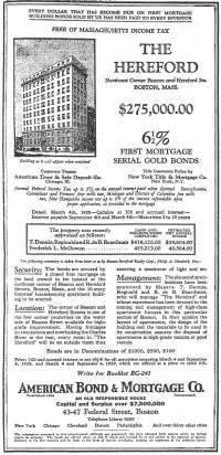 Advertisement by the American Bond & Mortgage Co. for the sale of bonds to finance construction of “The Hereford” at 428 Beacon; Boston Globe, 22Mar1926
