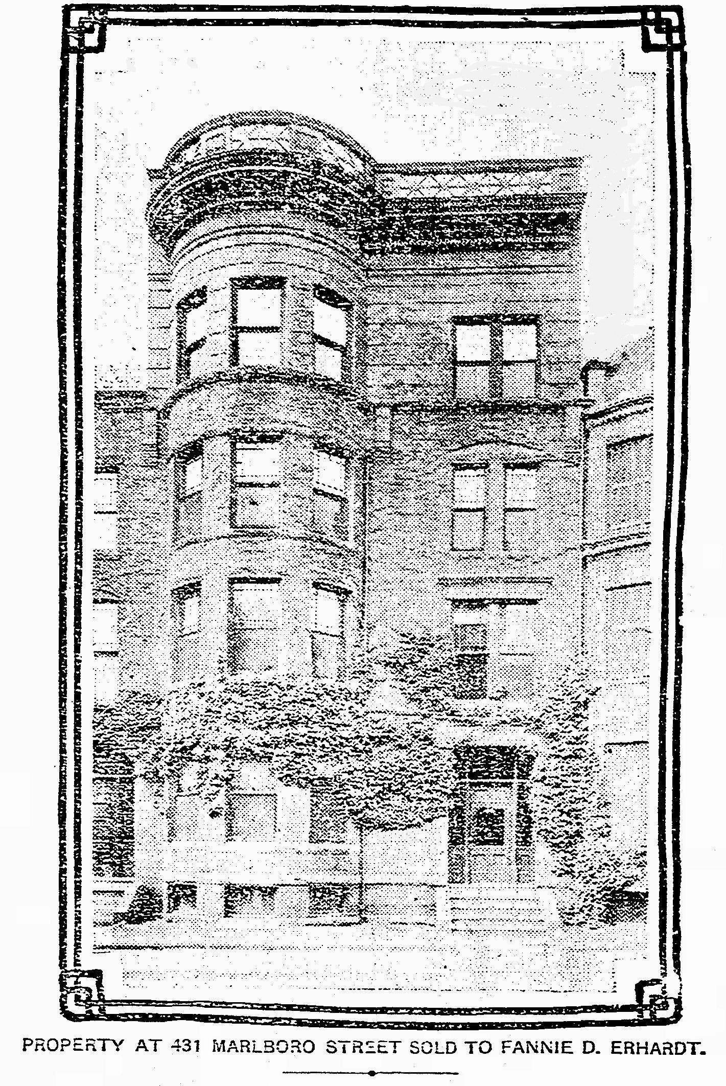 On June 23, 1904, 431 Marlborough was purchased from the Sprague family by Fannie Marie (Doane) Rumsey Erhardt, the wife of Justus Erhardt, an instructor at MIT. They previously had lived at 1069 Boylston.