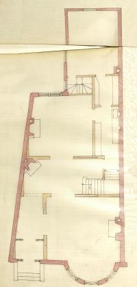 First floor plan of 445 Marlborough, partially damaged; bound with the final building inspection report, 13Nov1886 (v. 16, p. 53 (153)); courtesy of the Boston City Archives