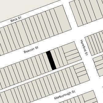 At the same time as he purchased 447 Beacon, Grenville Braman petitioned the Board of Aldermen for permission to build a wooden stable, for his own use, at the corner of Parker and Marlborough streets. It is not known whether the stable was built but, if it was, it subsequently was removed when Parker Street was sold several years later and used for residential housing.