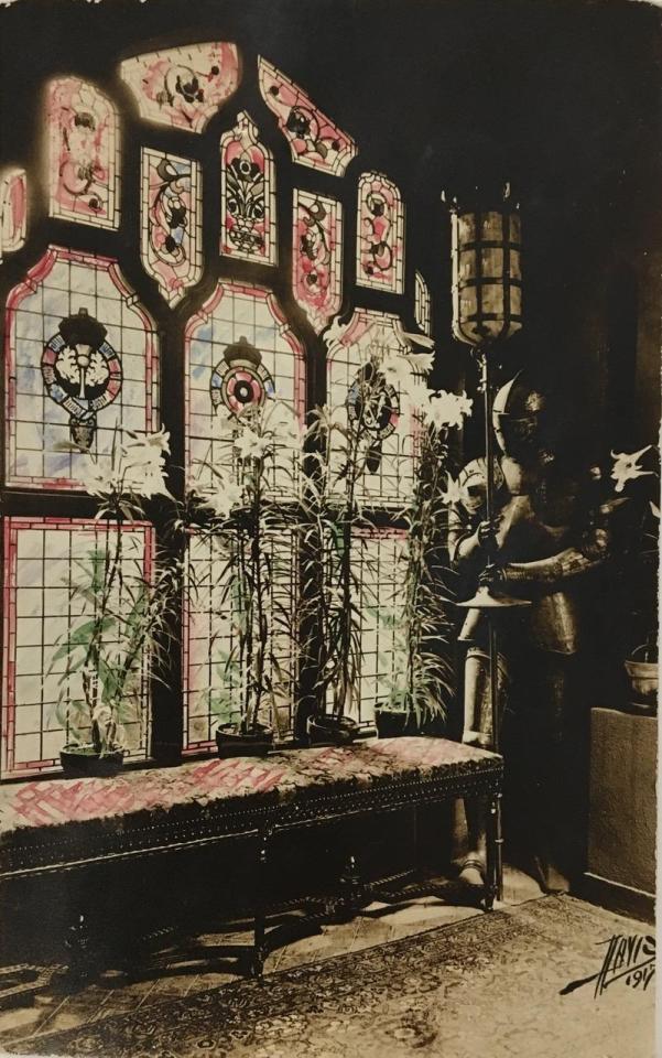Beac 448 – stained glass window (ca 1914) ← Previous Next → Postcard from Mabel Hunt Slater to Cardinal William Henry O’Connell ca. 1917, with the message “A favorite corner at 448 Beacon St. leading into music room. Does it not suggest Italy?”; courtesy of the Roman Catholic Archdiocese of Boston Archives