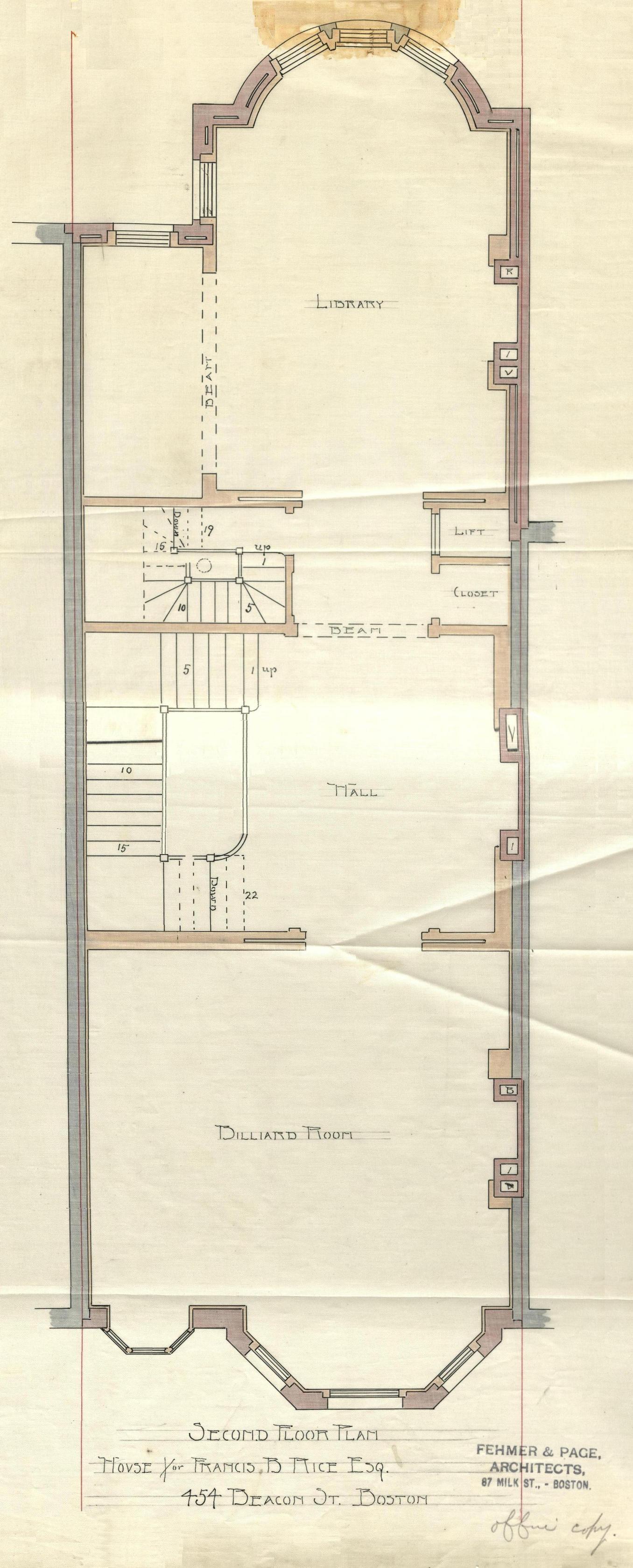 454 Beacon was designed by Fehmer and Page, architects, and built in 1890 by Lyman D. Willcutt, mason, as the home of retired cotton manufacturer Francis Blake Rice and his wife, Sarah (Sallie) Blake (Austin) Rice. He is shown as the owner on the original building permit application, dated June 19, 1890, and on the final building inspection report, dated October 23, 1891.