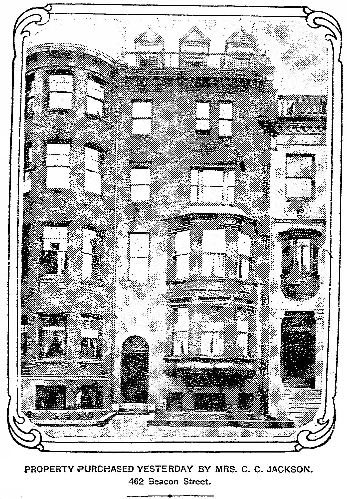 On November 16, 1904, 462 Beacon was purchased from the estate of William Sumner Appleton, Sr., by Frances Elizabeth (Appleton) Jackson, the wife of stockbroker Charles Cabot Jackson. She was William Sumner Appleton, Sr.’s first cousin, twice removed. The Cabots lived at 301 Marlborough and appear not to have moved to 462 Beacon until after the 1904-1905 winter season.
