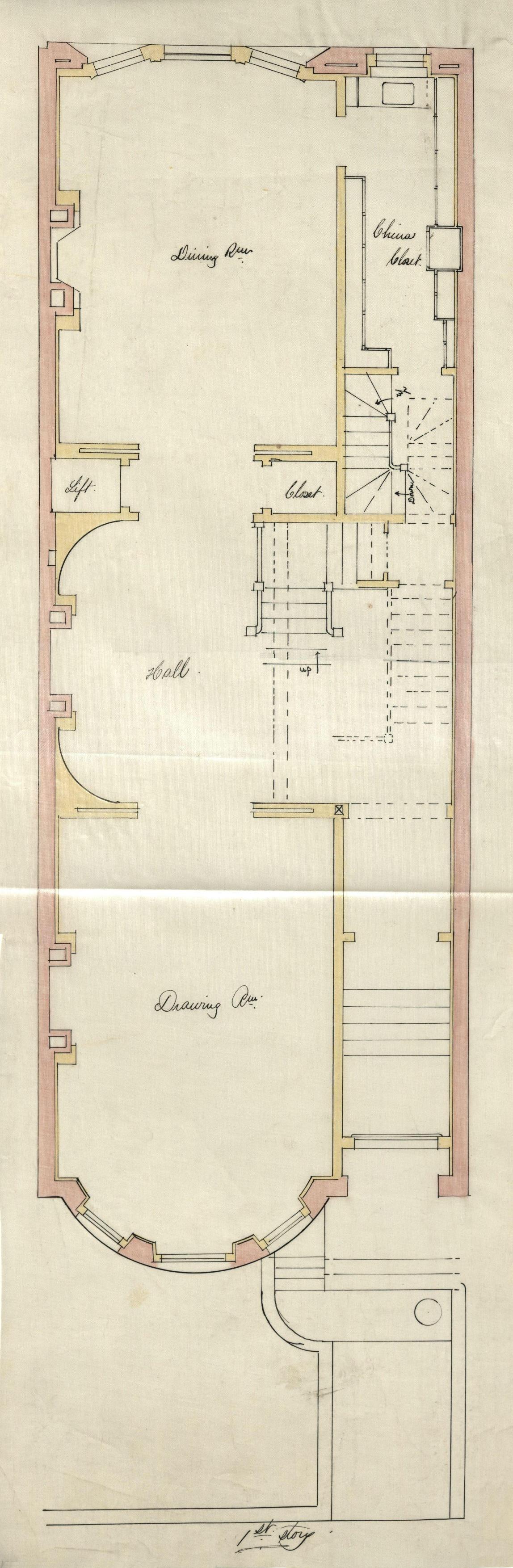 First floor plan of 474 Beacon, bound with the final building inspection report, 3Dec1892 (v. 49, p. 7); Boston City Archives