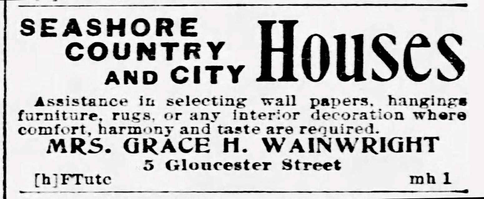 The trust established for the benefit of Grace Wainwright and her two children continued to own 5 Gloucester. Under the terms of the trust, if she and her children predeceased her father, John Whitney Beals, the remainder was to be paid to him. He died in September of 1914, and on March 9, 1915, at Grace Wainwright’s request, the trust transferred 5 Gloucester to Virginia and Howard Wainwright.